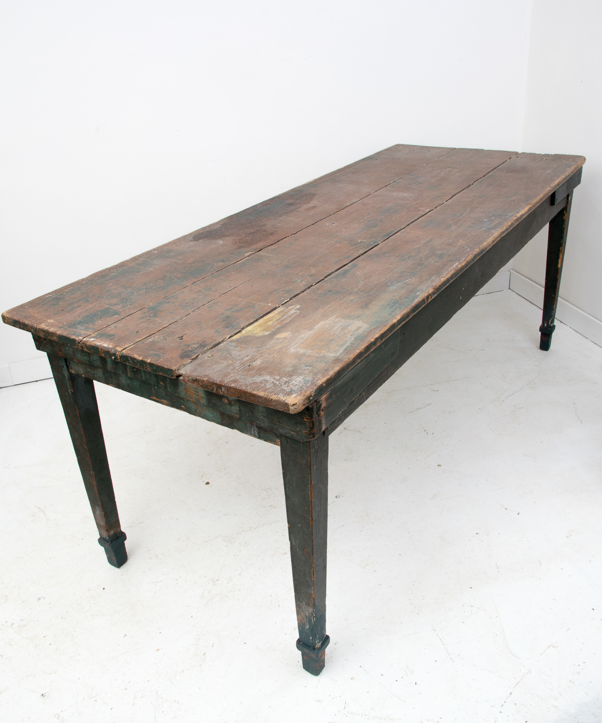 Antique oak dining table. Interesting patina with lovely aged crackled paint. 3 plank worn top.