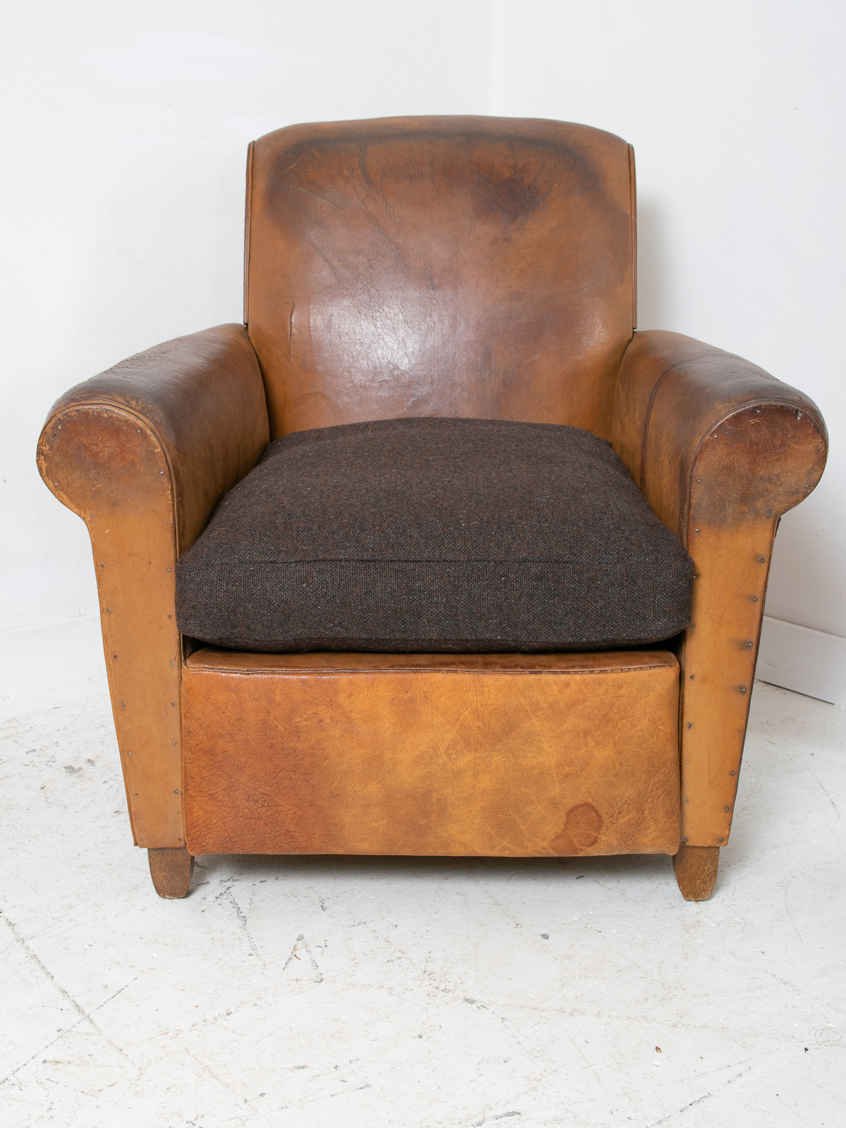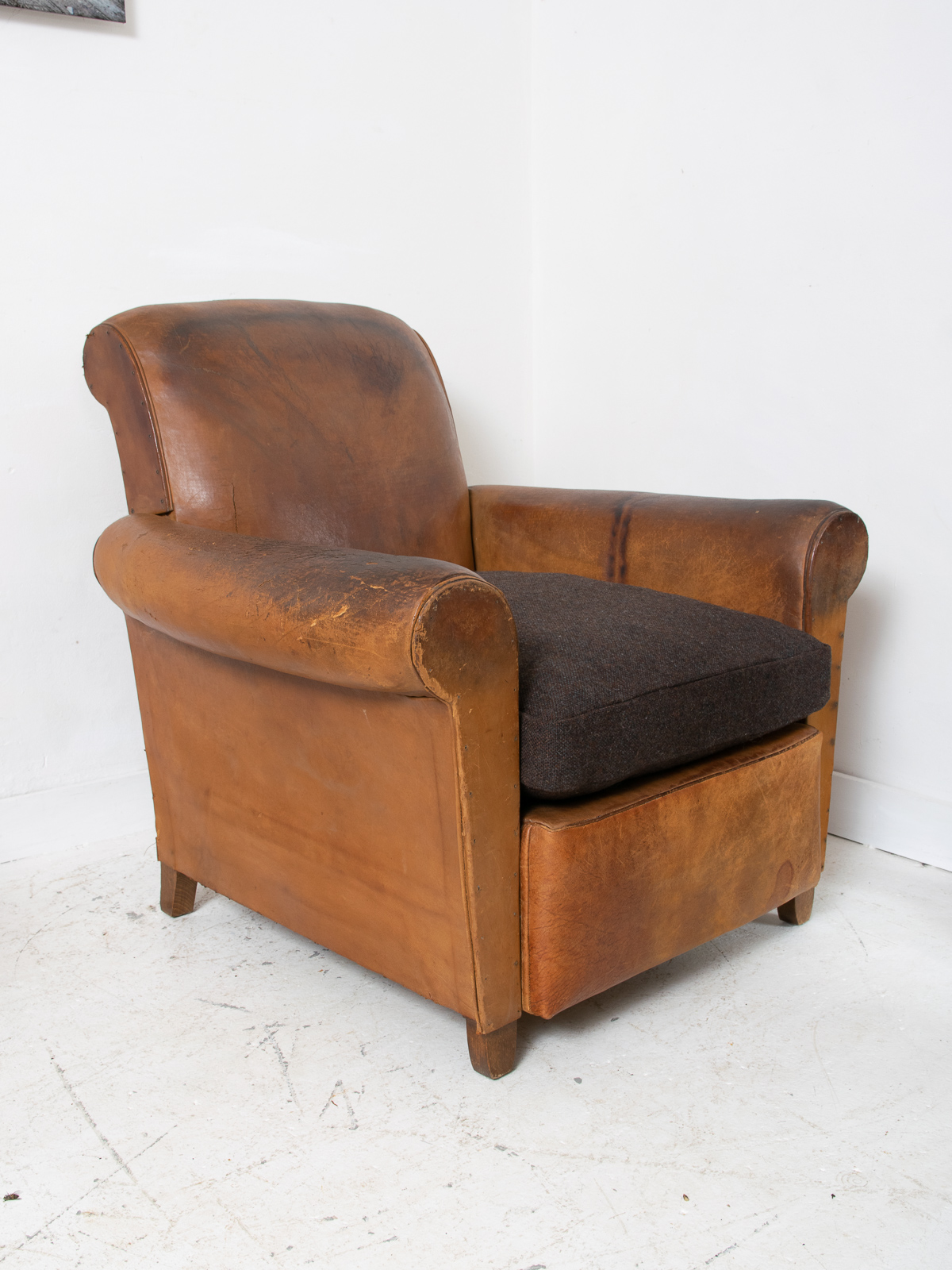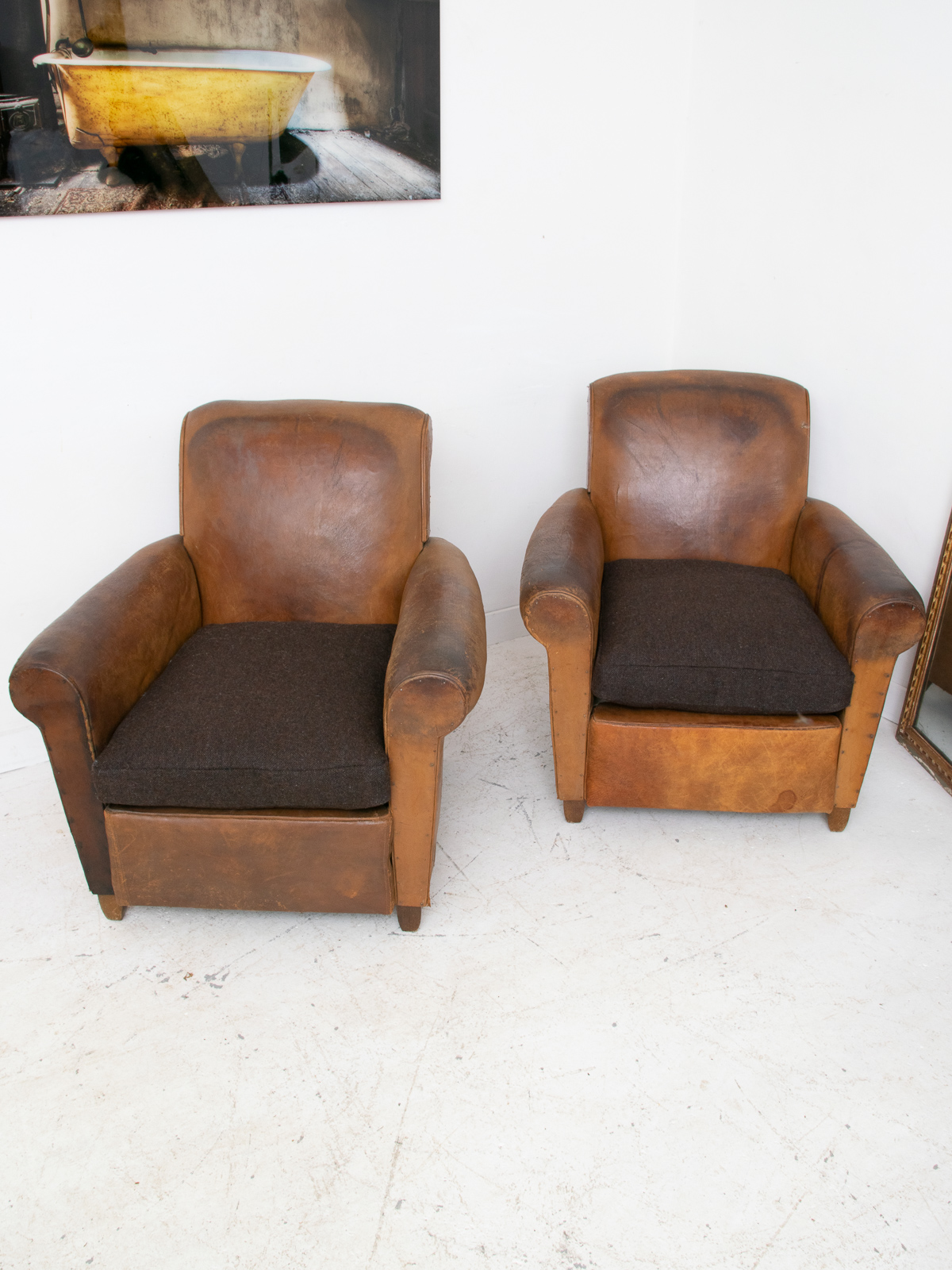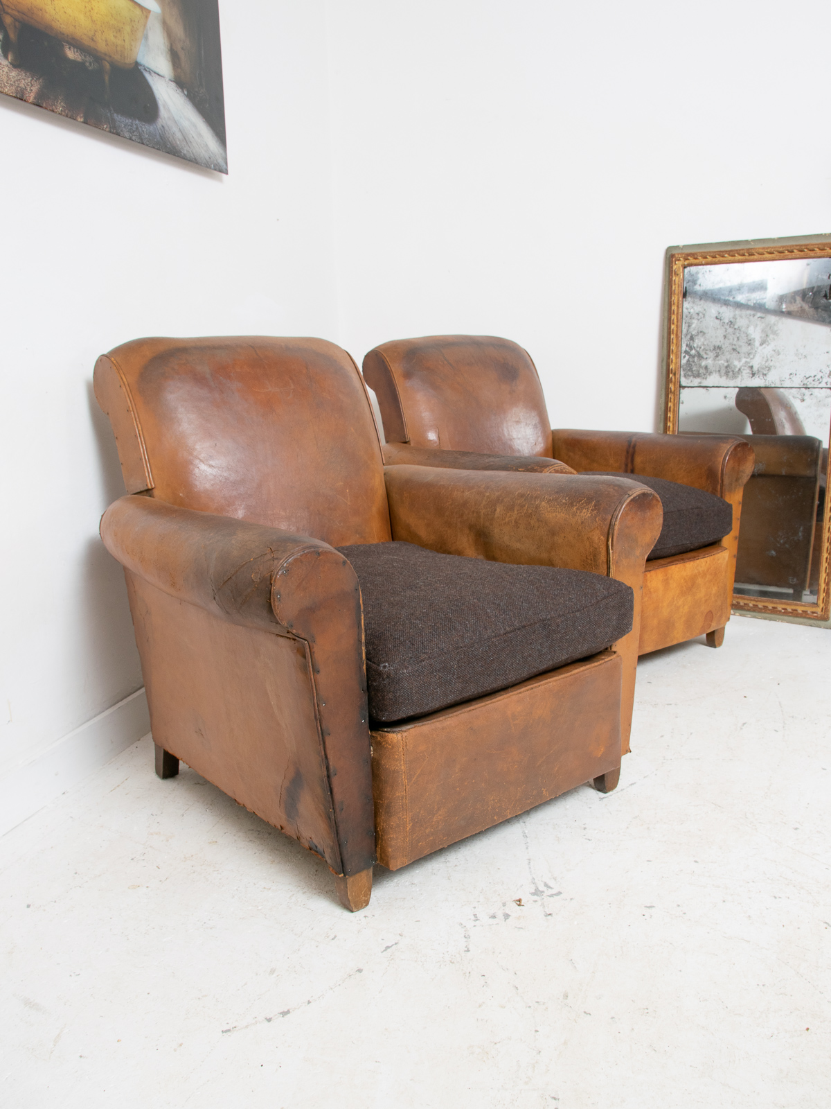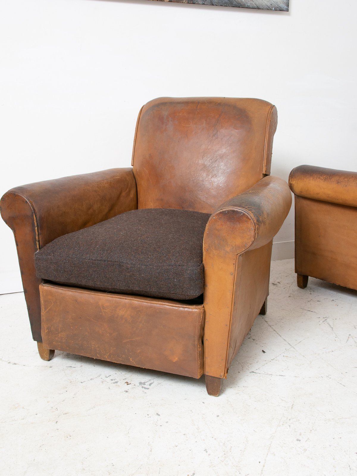 A pair of cigar coloured scroll back French club chairs. The chairs have undergone extensive restoration to repair rips and tears including some panel replacement using old leather from donor chairs. New feather seat cushion covered in dark brown Bute tweed. Comfortable and solid seat with no excessive sag. Excellent patina to the leather especially on the arms and back.