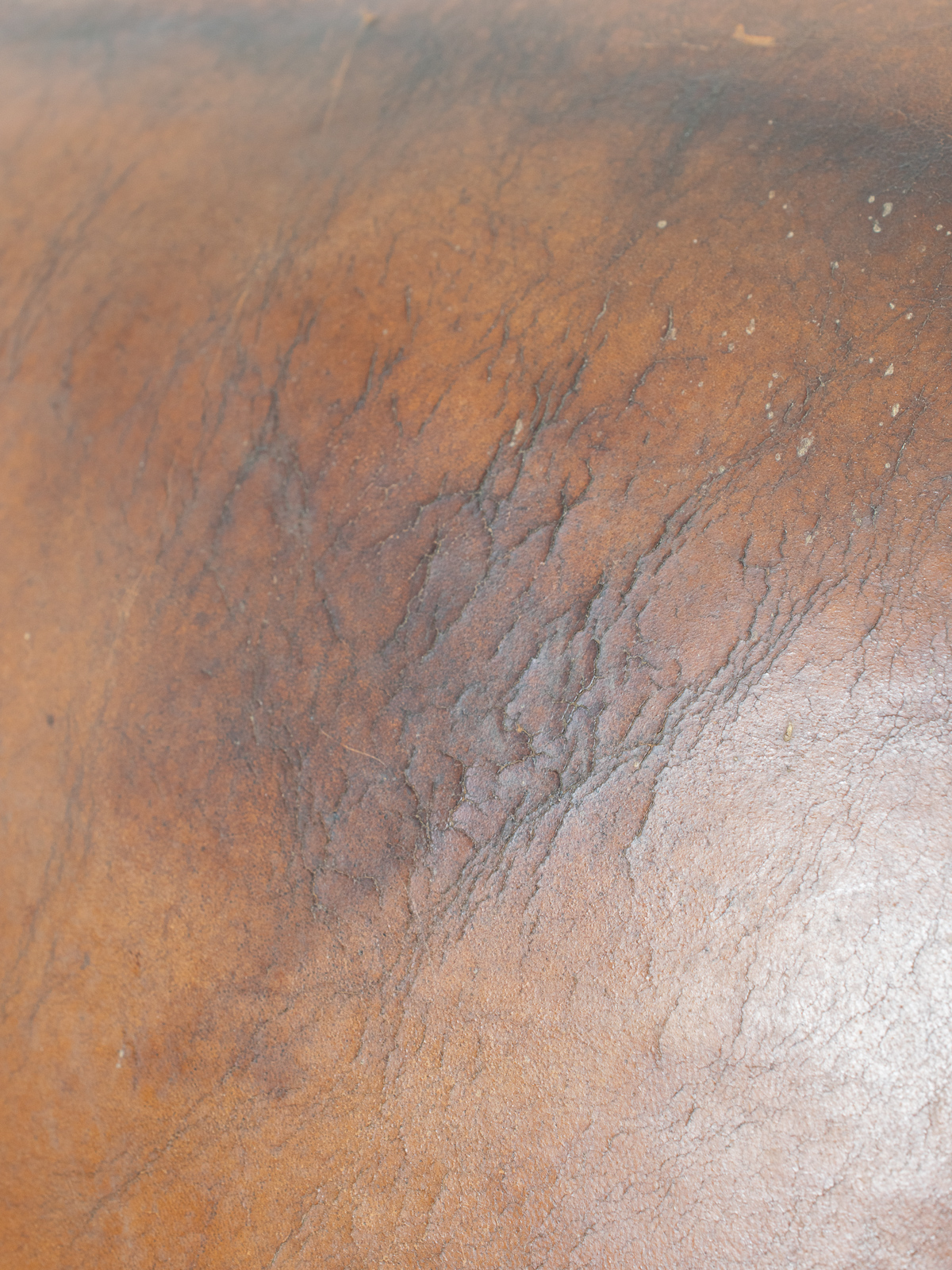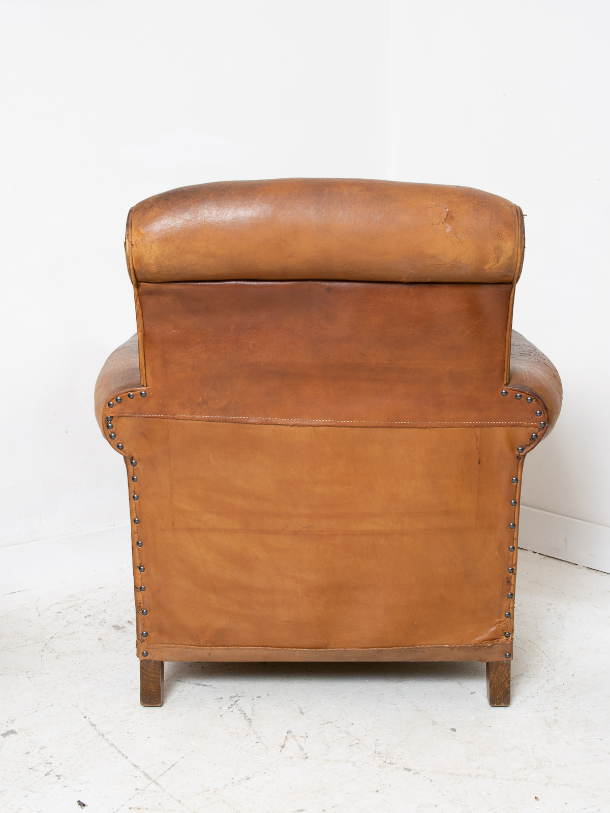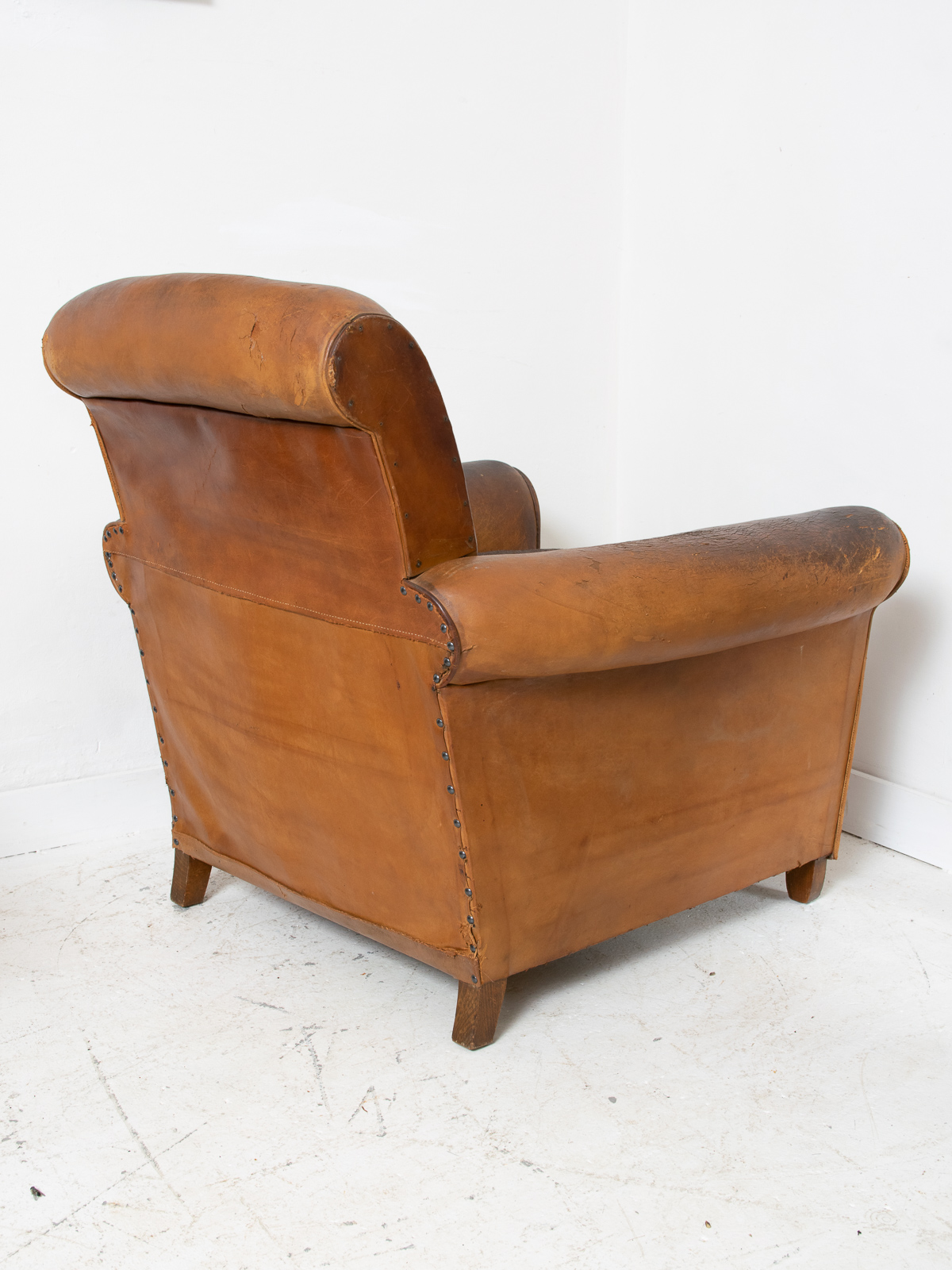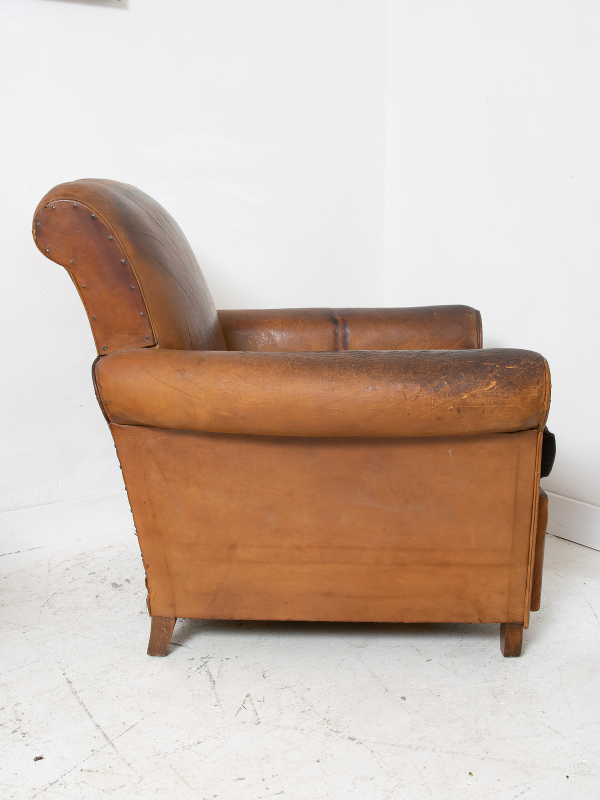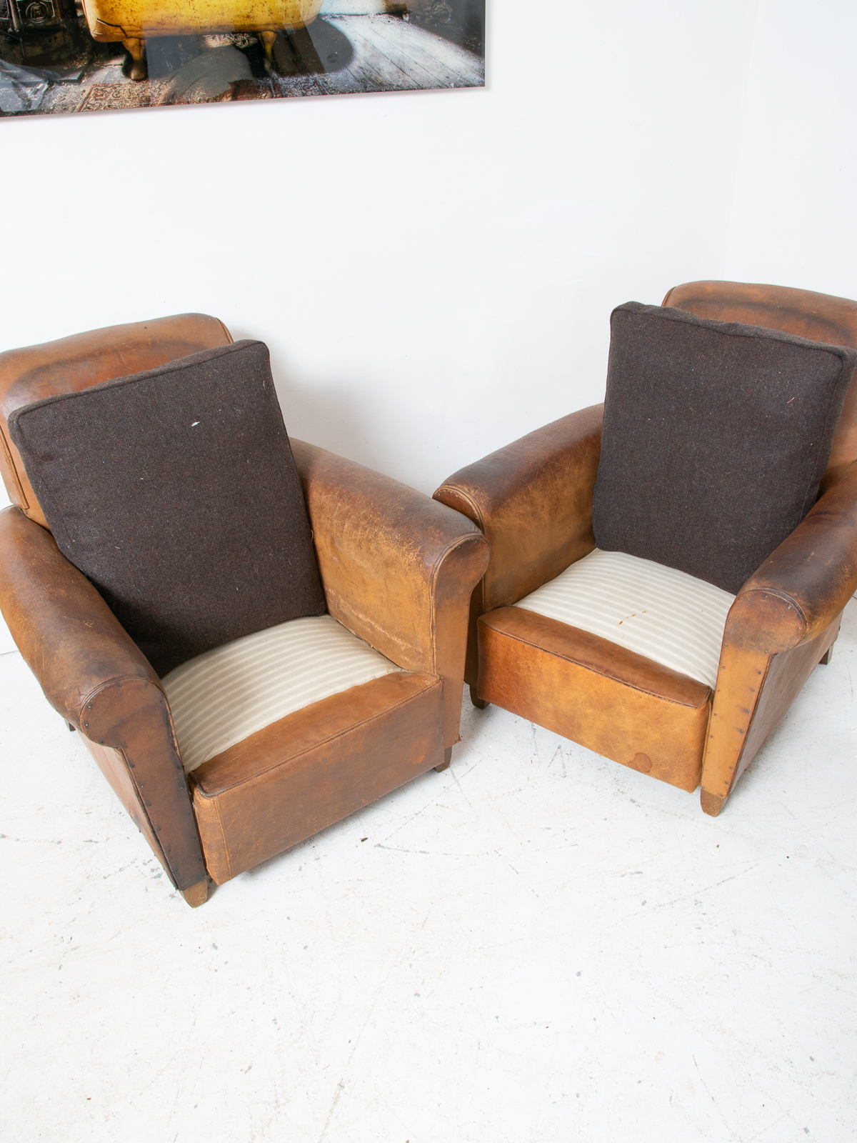 A pair of cigar coloured scroll back French club chairs. The chairs have undergone extensive restoration to repair rips and tears including some panel replacement using old leather from donor chairs. New feather seat cushion covered in dark brown Bute tweed. Comfortable and solid seat with no excessive sag. Excellent patina to the leather especially on the arms and back.