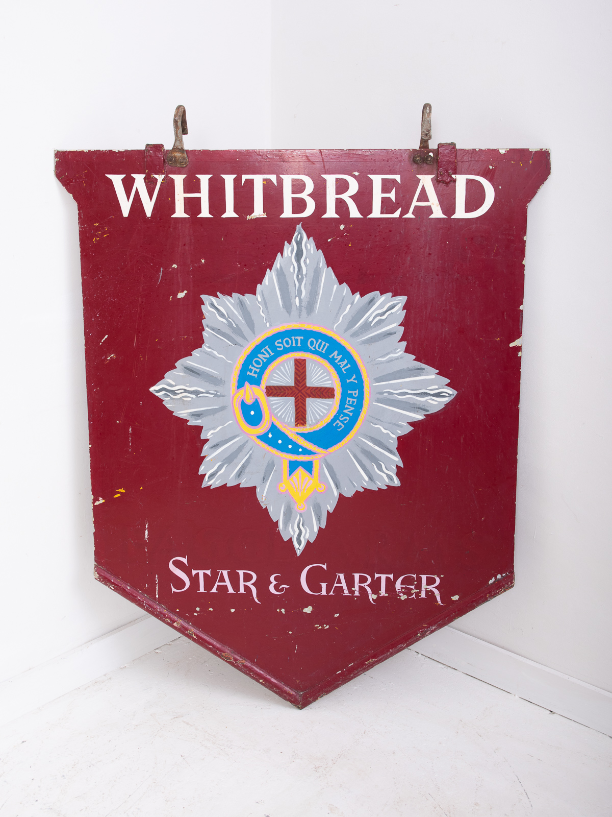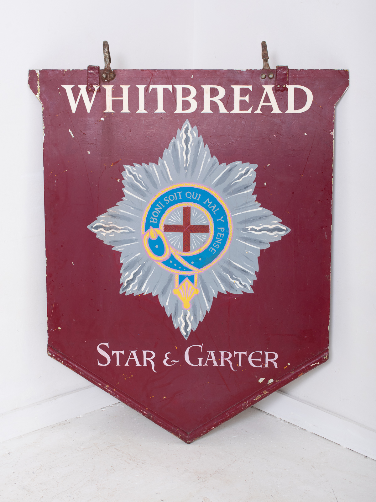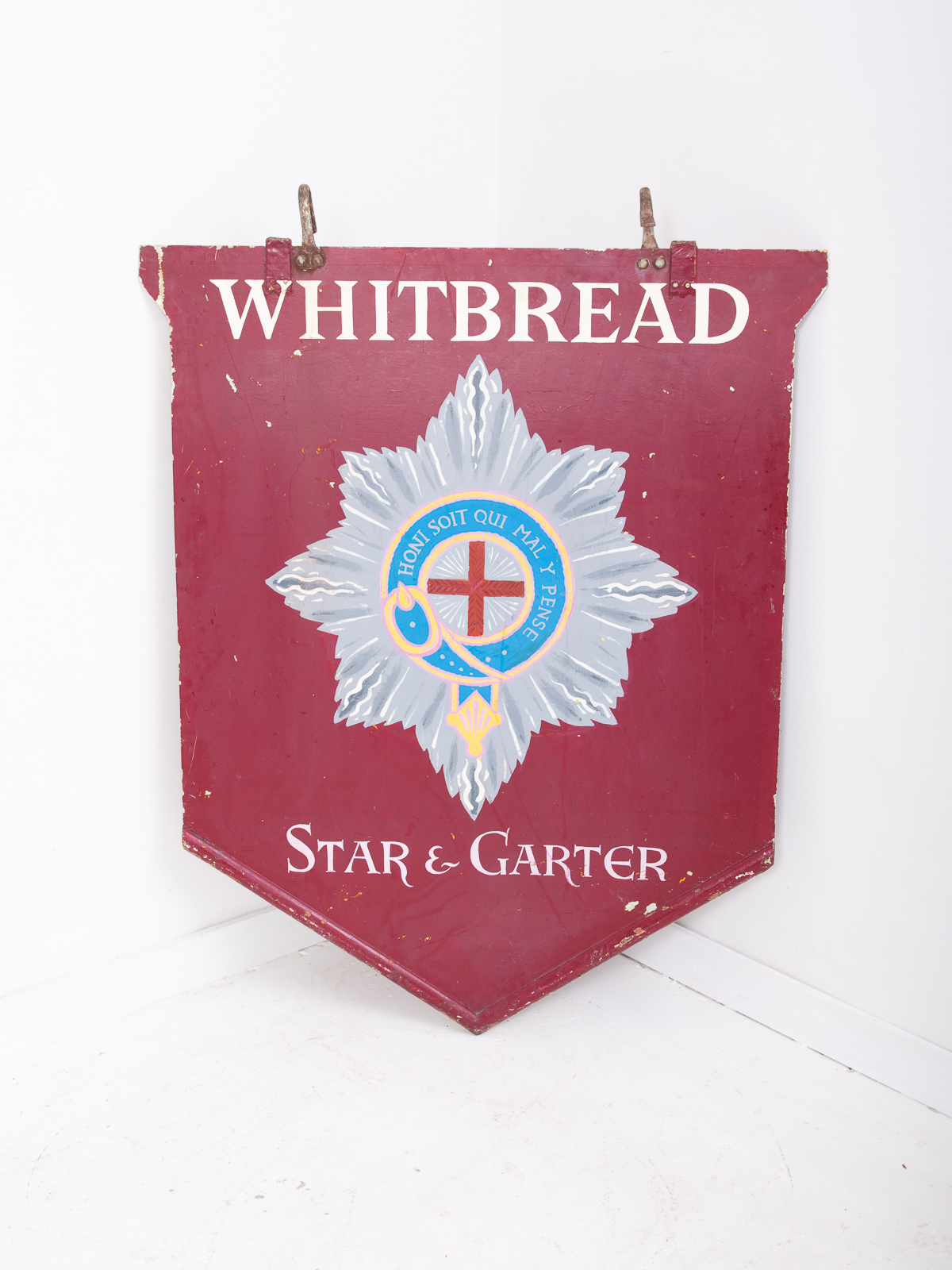An original metal hand painted pub sign manufactured around the 1940’s reclaimed from the Star & Garter public house in Deal, Kent. The building is now a private residence. Lovely authentic wear and patination to the paintwork.