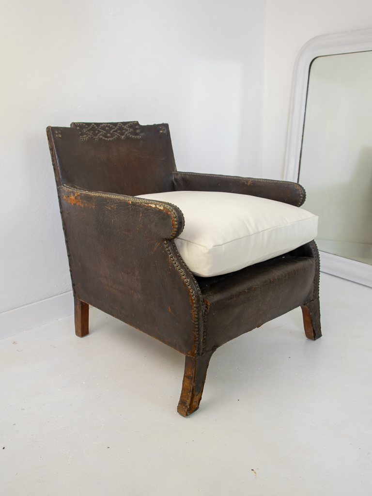 Art deco French leather club armchair. Some wear to the leather on the arms. New feather seat cushion with natural linen cover.