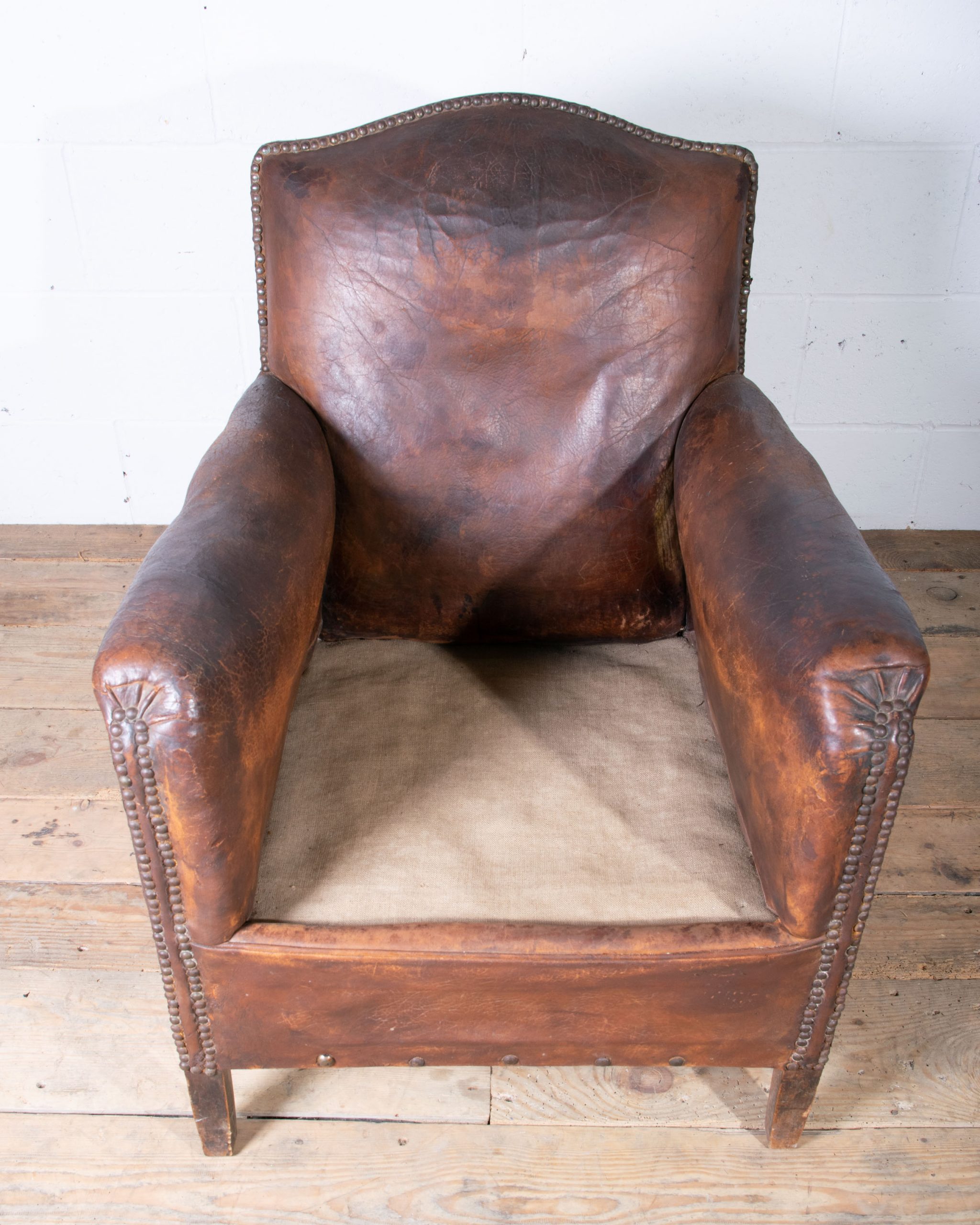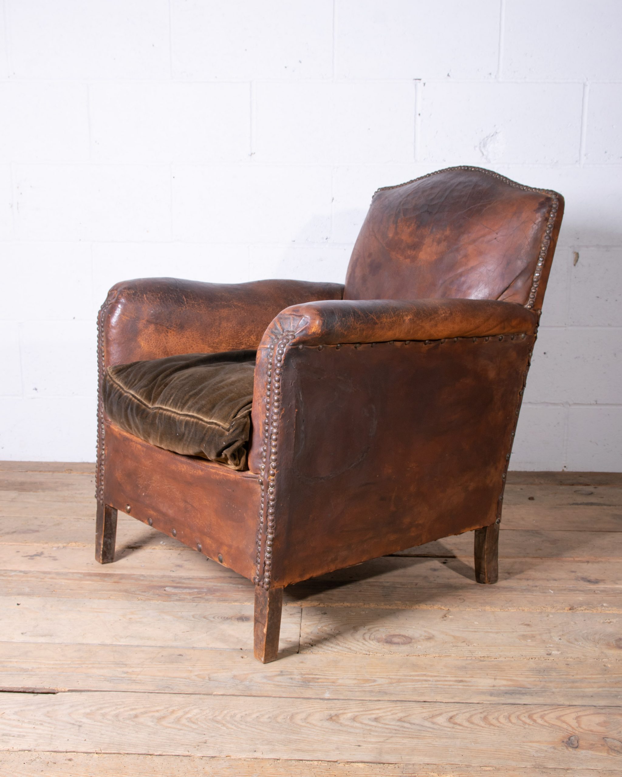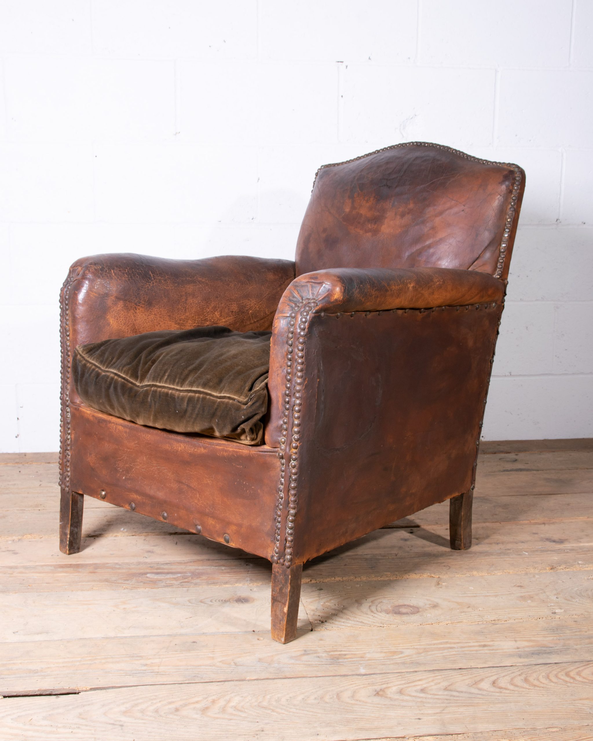 An early 20th century French studded club armchair. Tobacco coloured leather. Seat firm and comfortable. Original velvet cushion which could be replaced if preferred. Some repairs to the leather and arm stuffing worn in places.