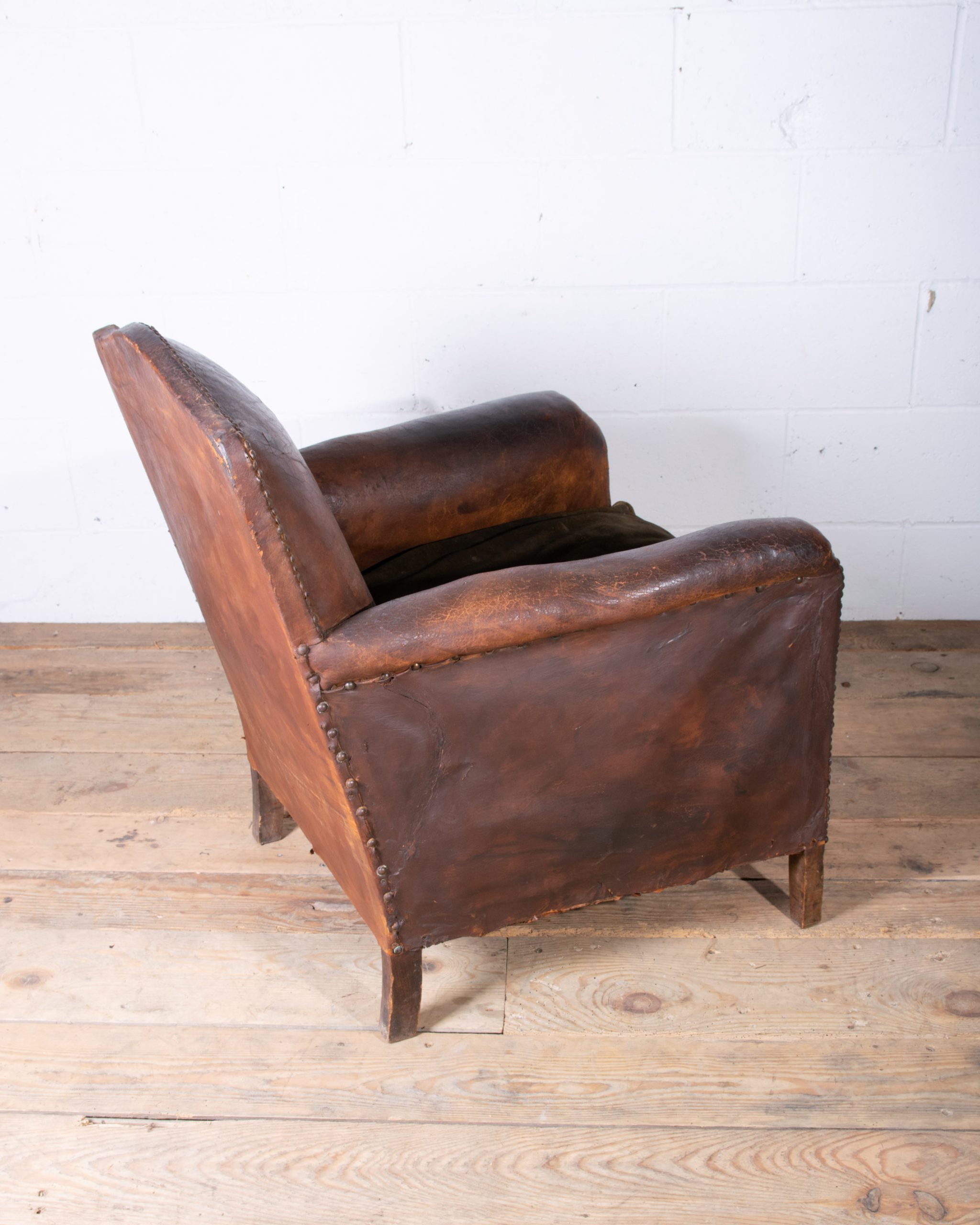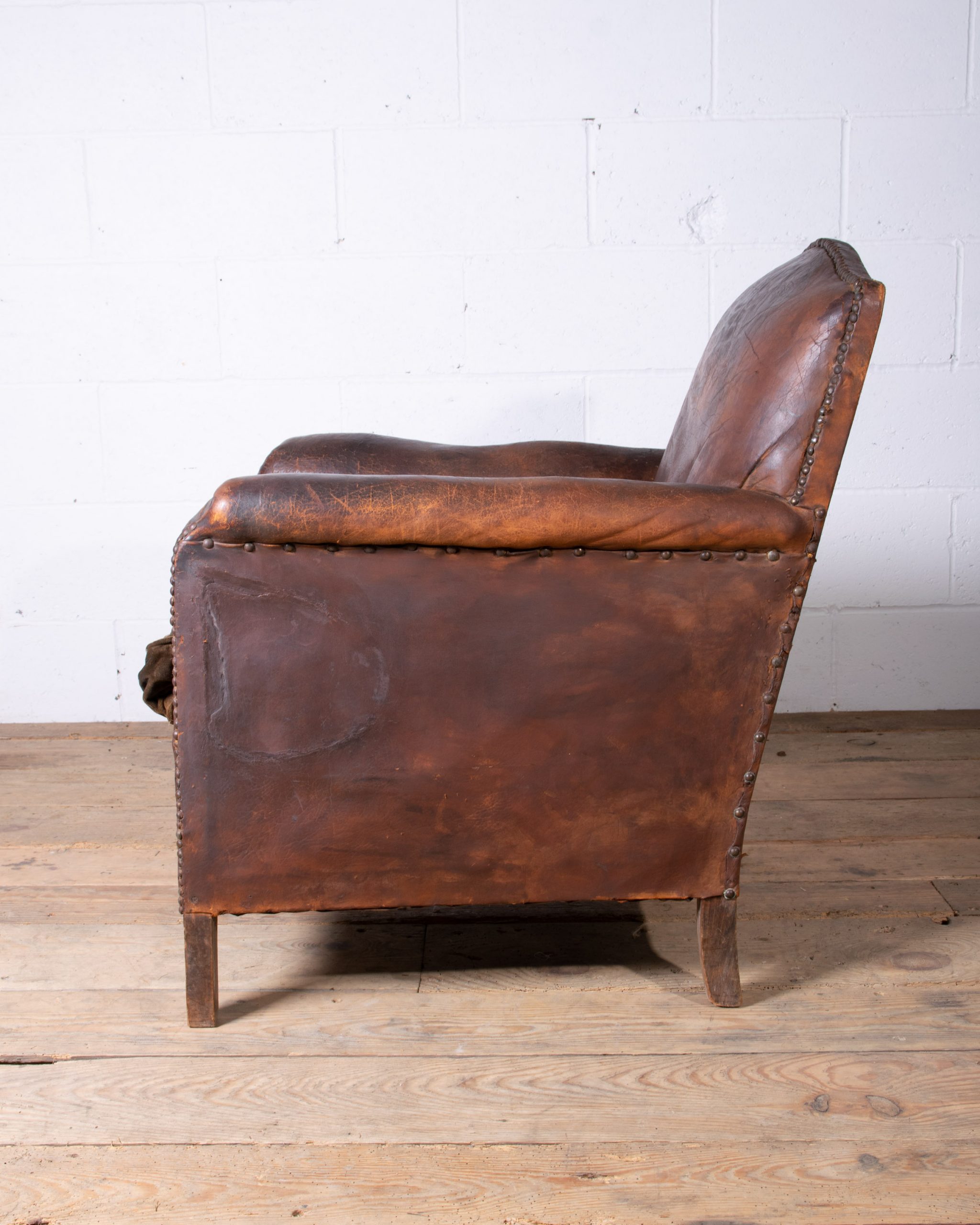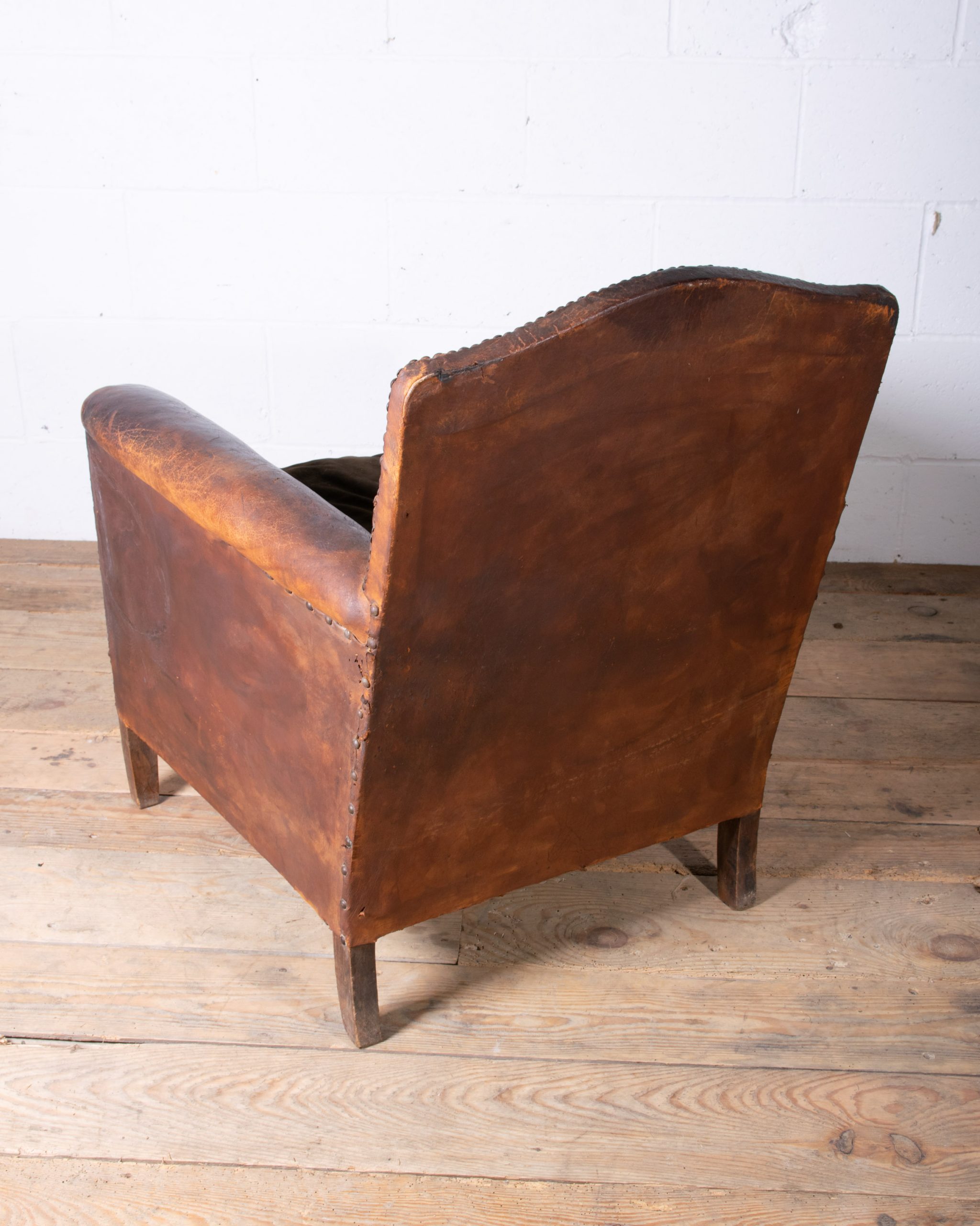 An early 20th century French studded club armchair. Tobacco coloured leather. Seat firm and comfortable. Original velvet cushion which could be replaced if preferred. Some repairs to the leather and arm stuffing worn in places.