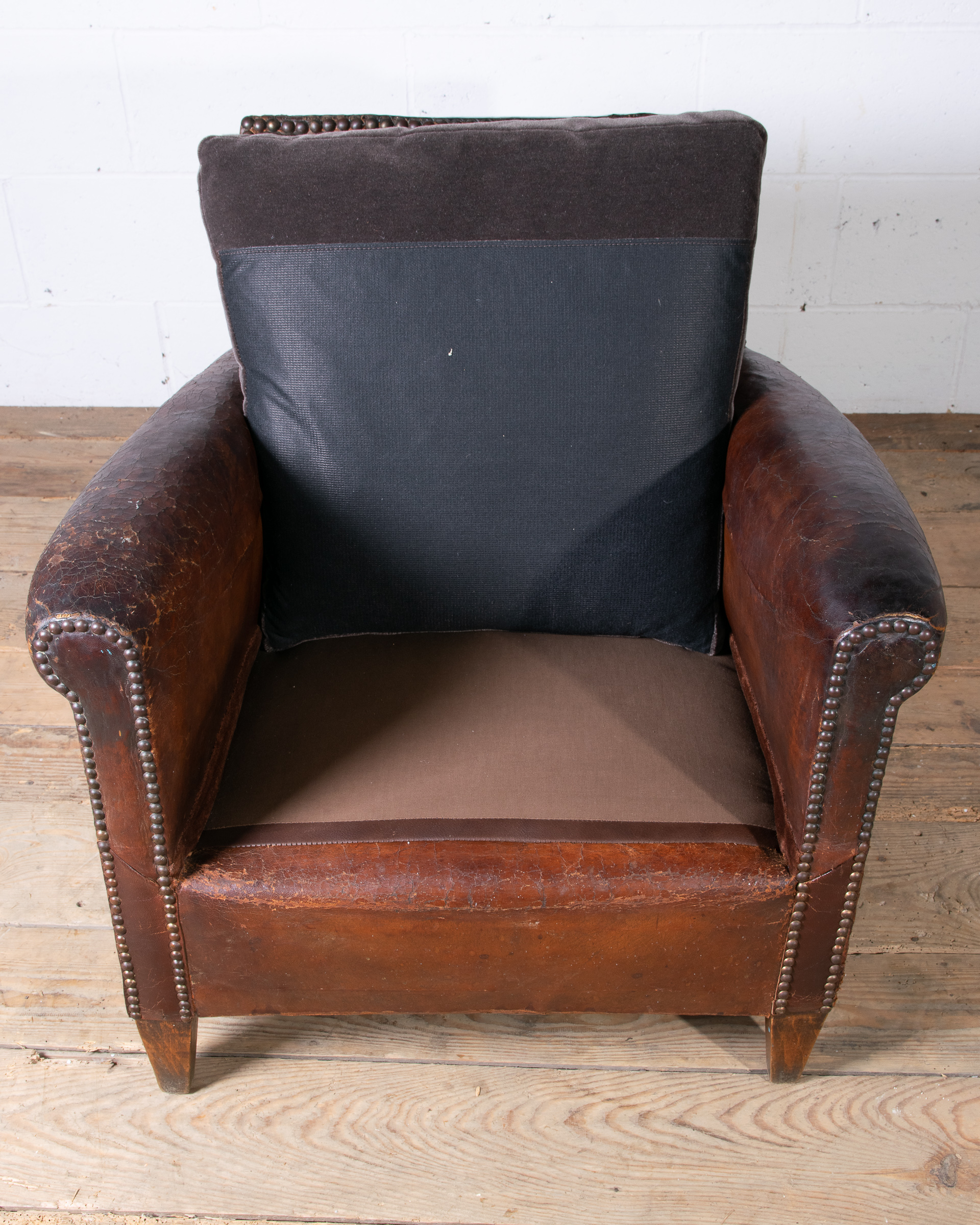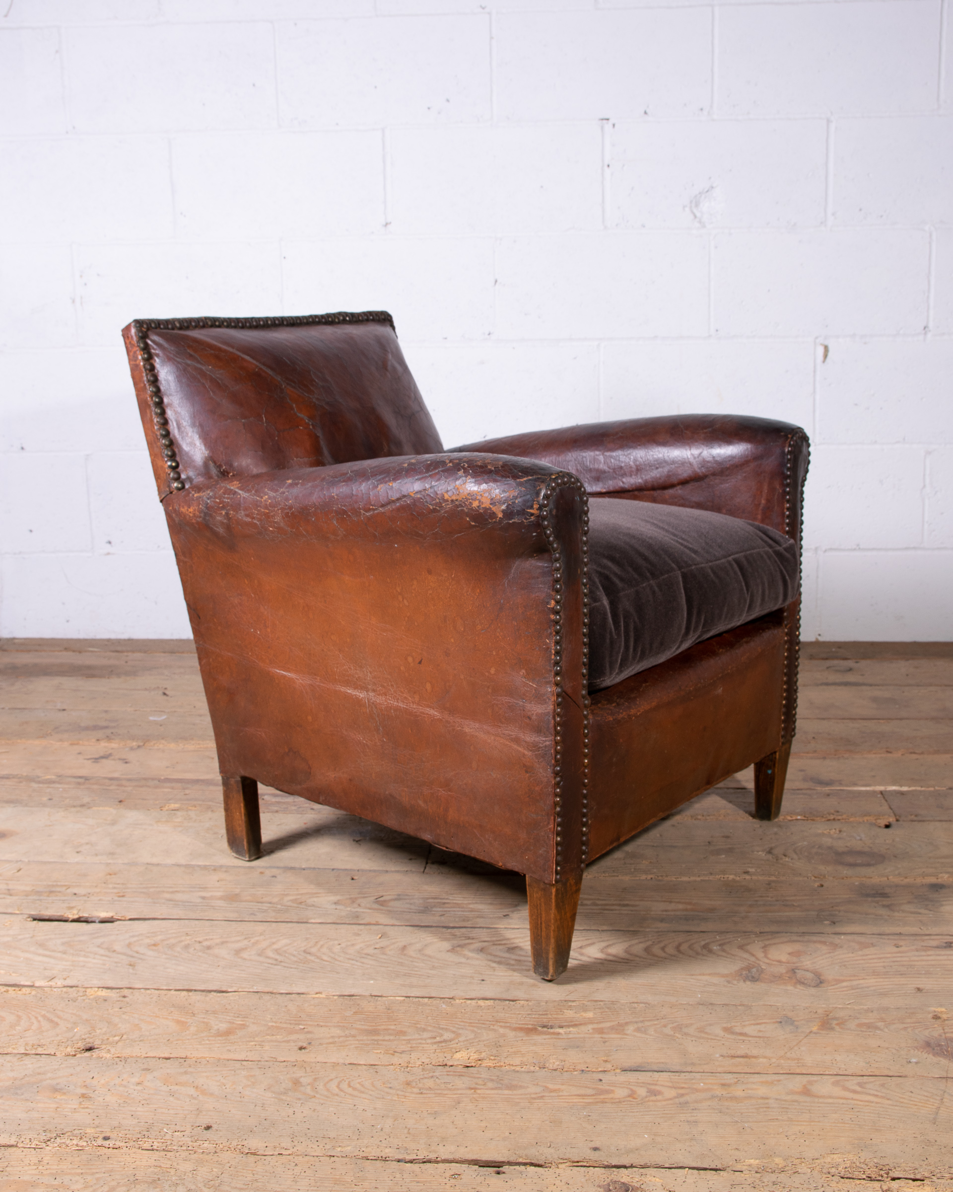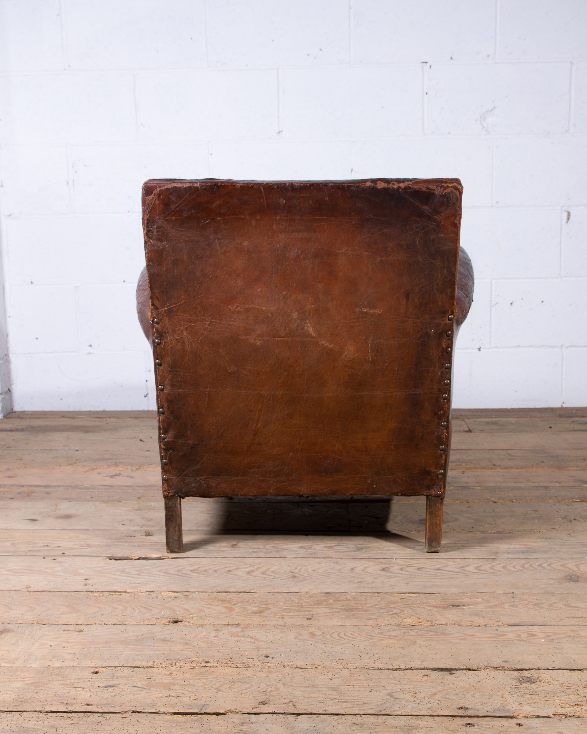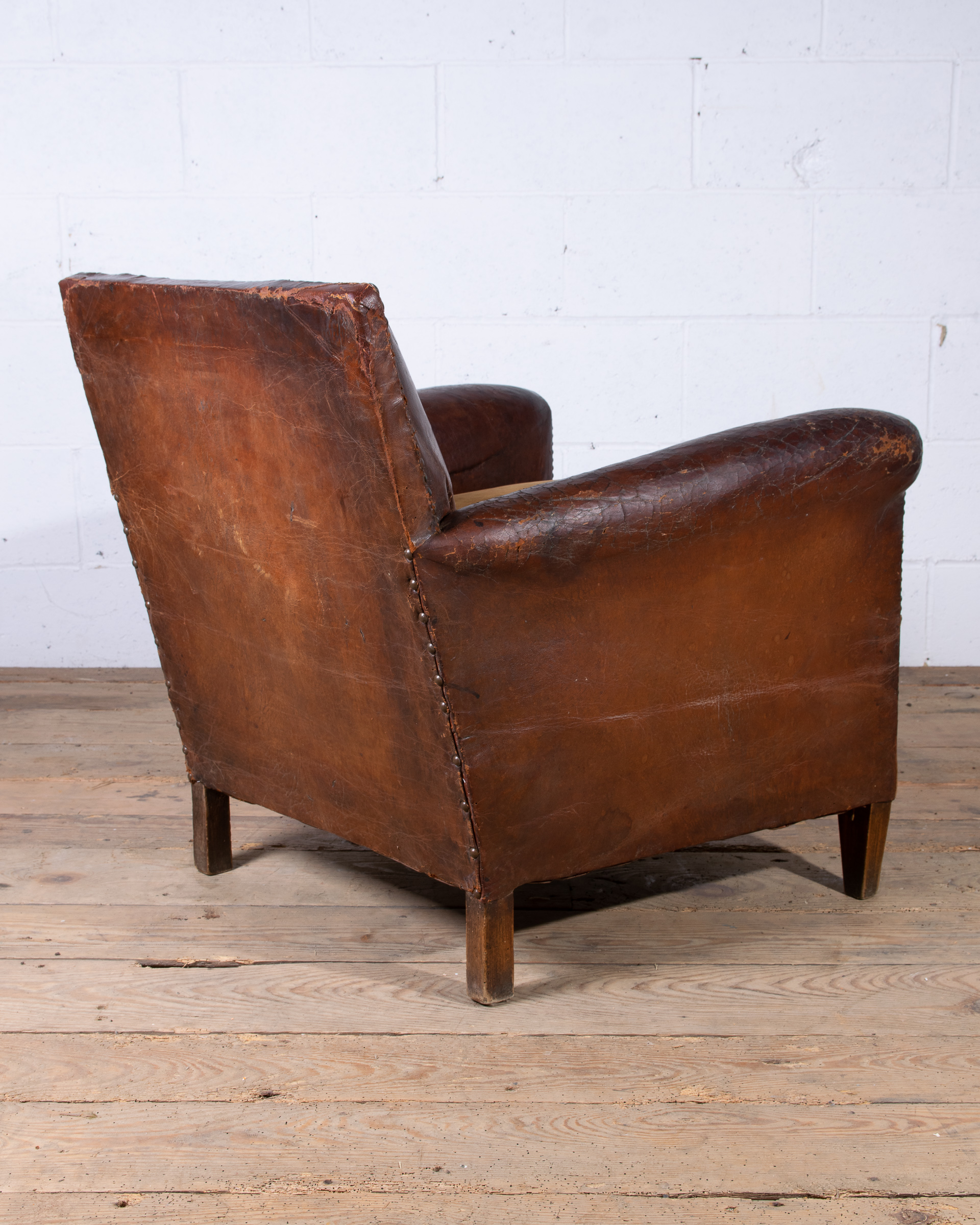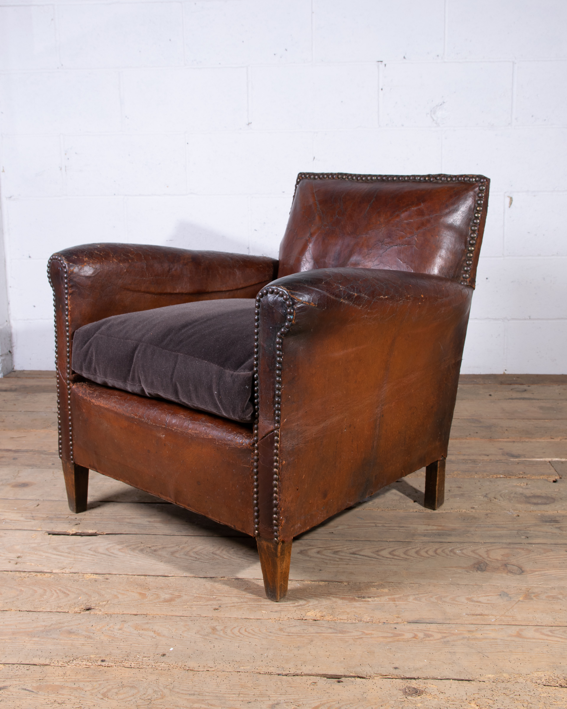 An early 20th century French leather club armchair with studded scroll arms. Lovely geometry means this is a super comfortable armchair. The chair has been extensively stripped and restored, strengthening the frame adding new springs and back and seat pad.
