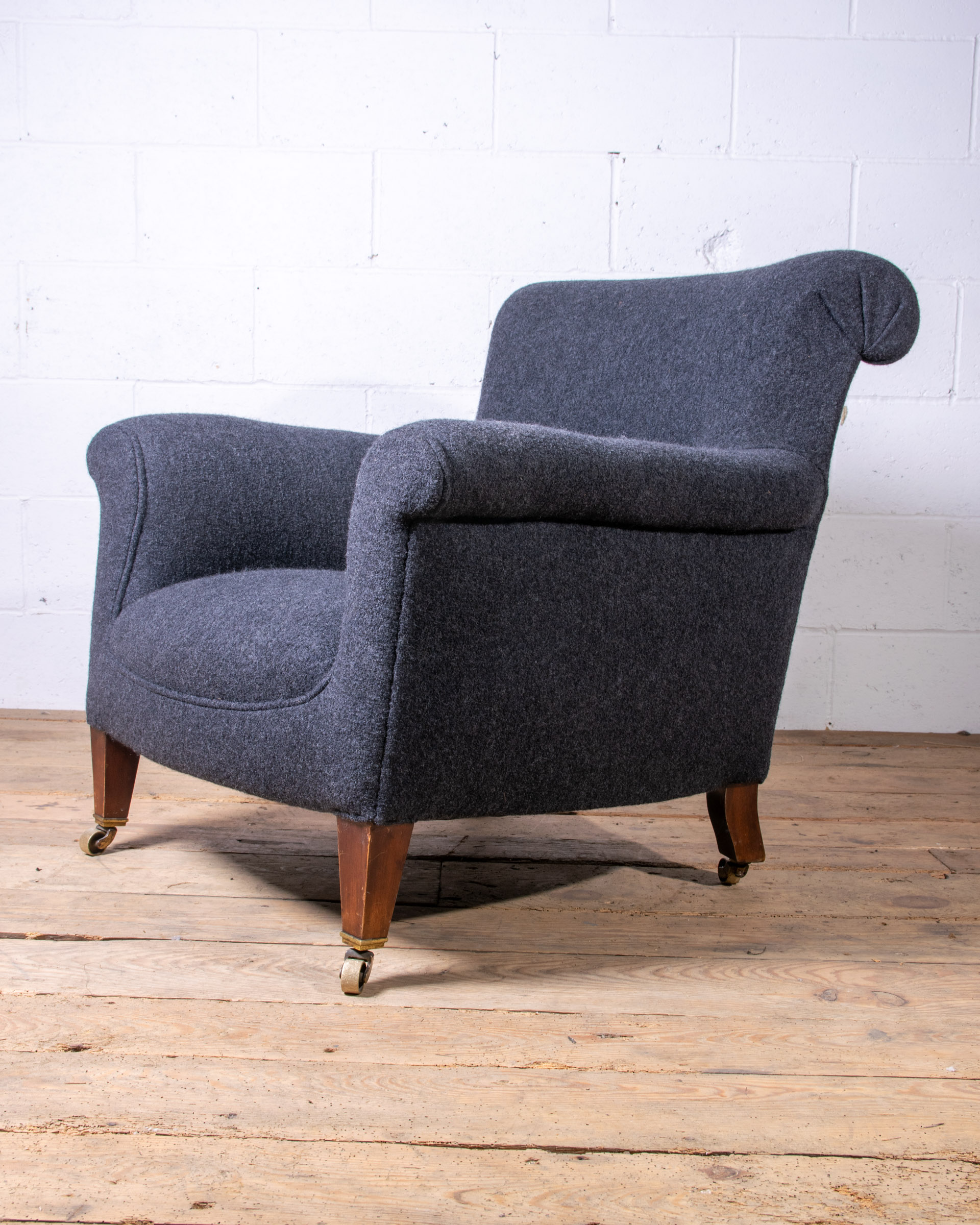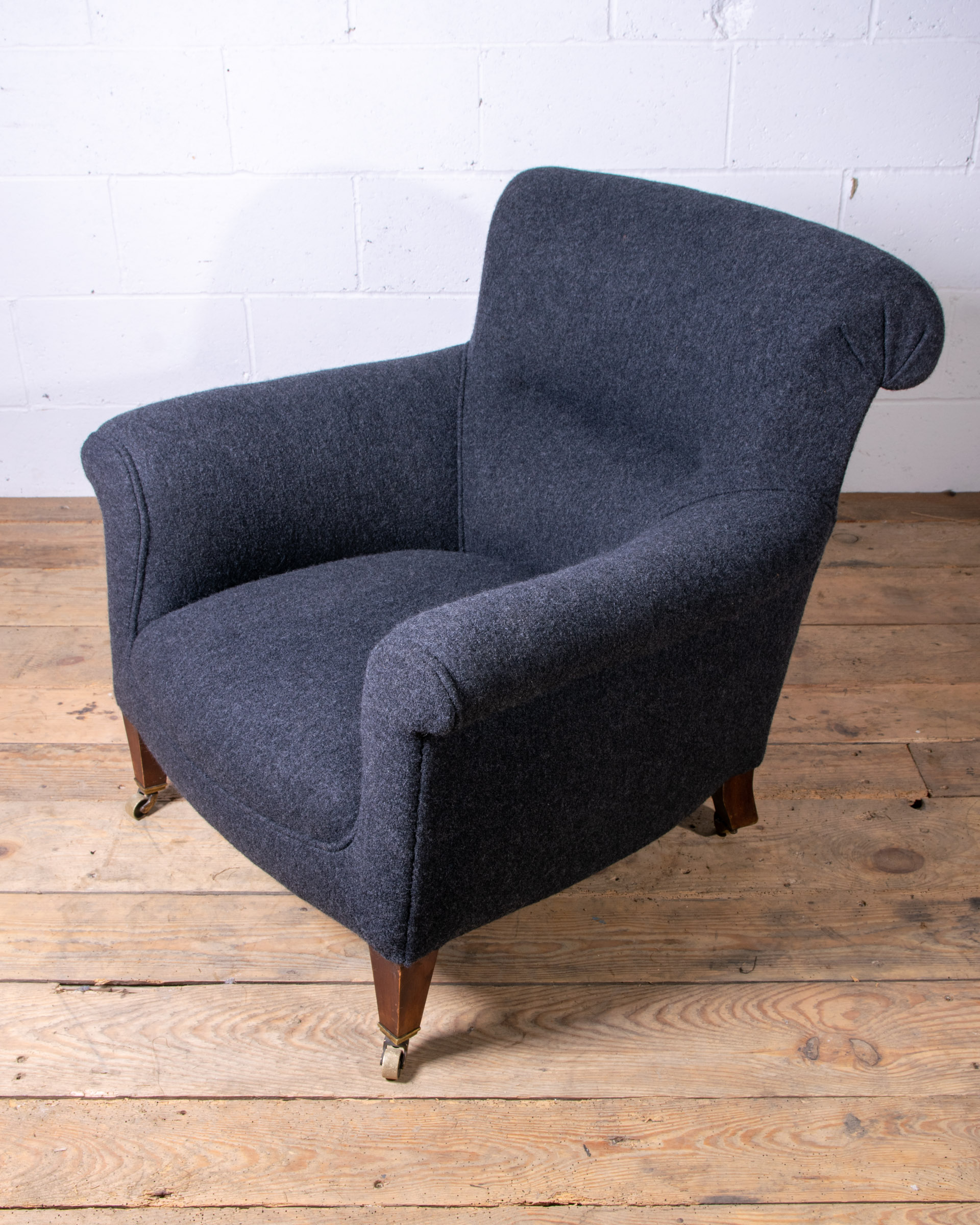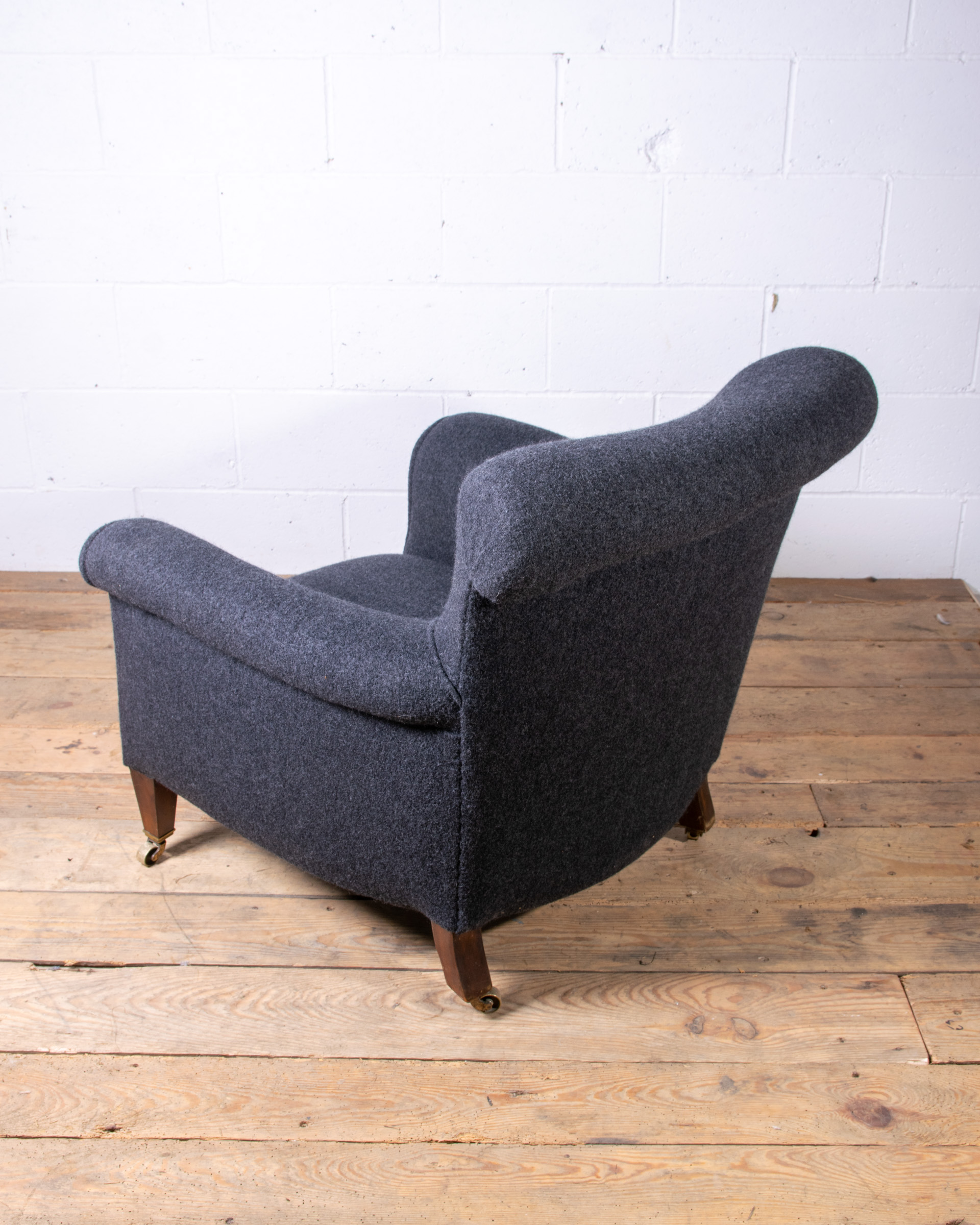 A late 19th century Howard & Sons style easy armchair with built in seat pad and scroll back.  It sits on tapered mahogany legs and its original castors.  The seat has hand-lashed springs and horsehair stuffing.  The armchair has been meticulously restored in-house and recovered in thick Italian boiled wool fabric from Holland & Sherry.