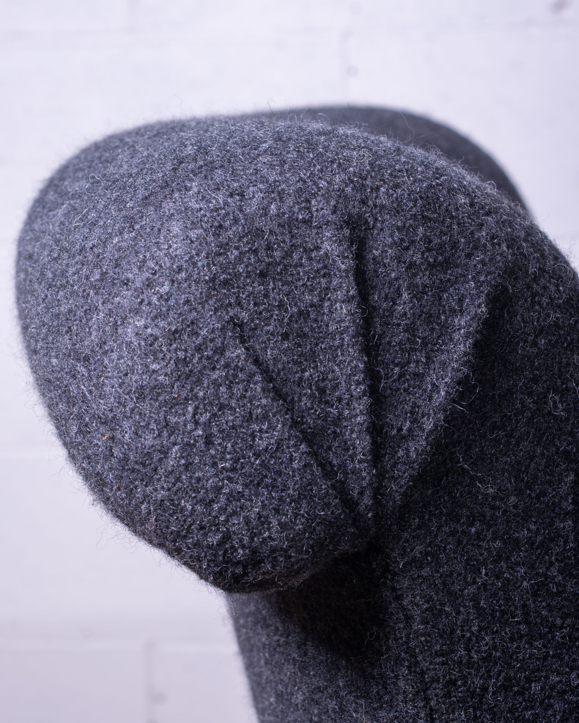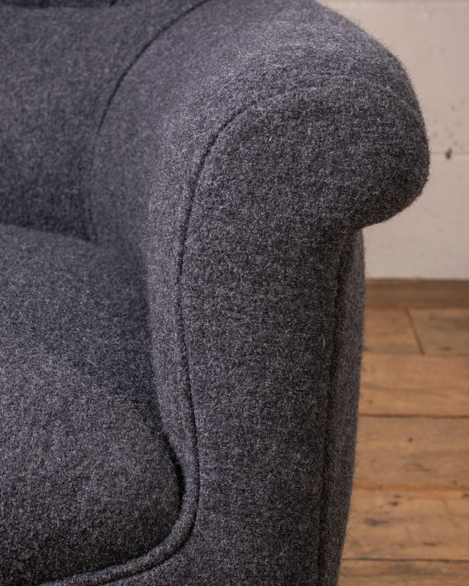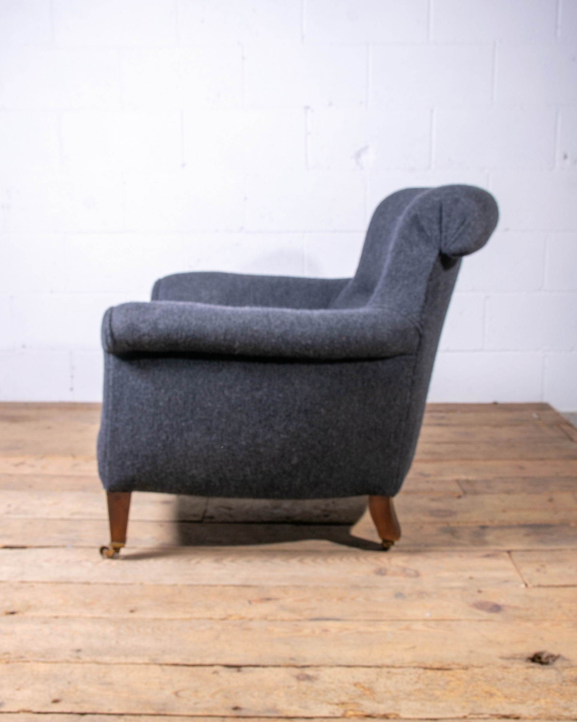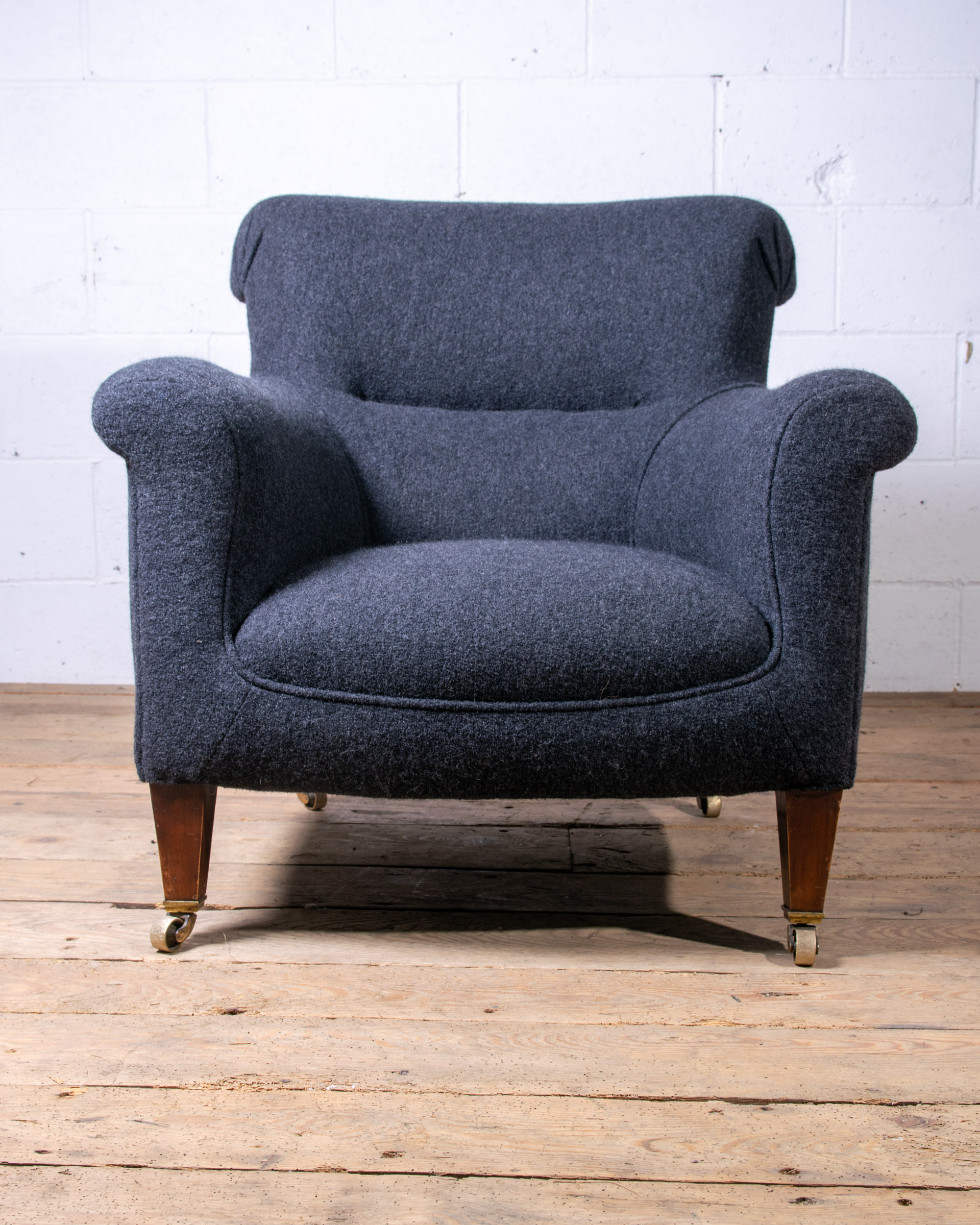 A late 19th century Howard & Sons style easy armchair with built in seat pad and scroll back.  It sits on tapered mahogany legs and its original castors.  The seat has hand-lashed springs and horsehair stuffing.  The armchair has been meticulously restored in-house and recovered in thick Italian boiled wool fabric from Holland & Sherry.