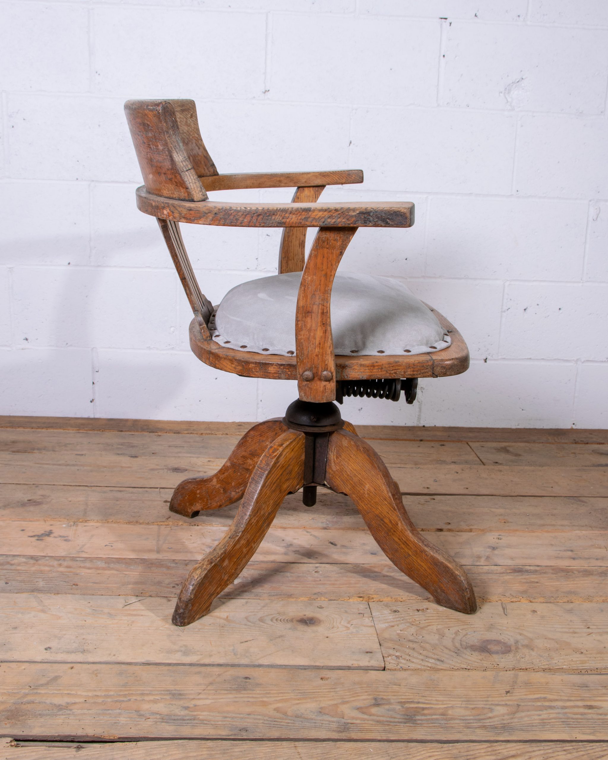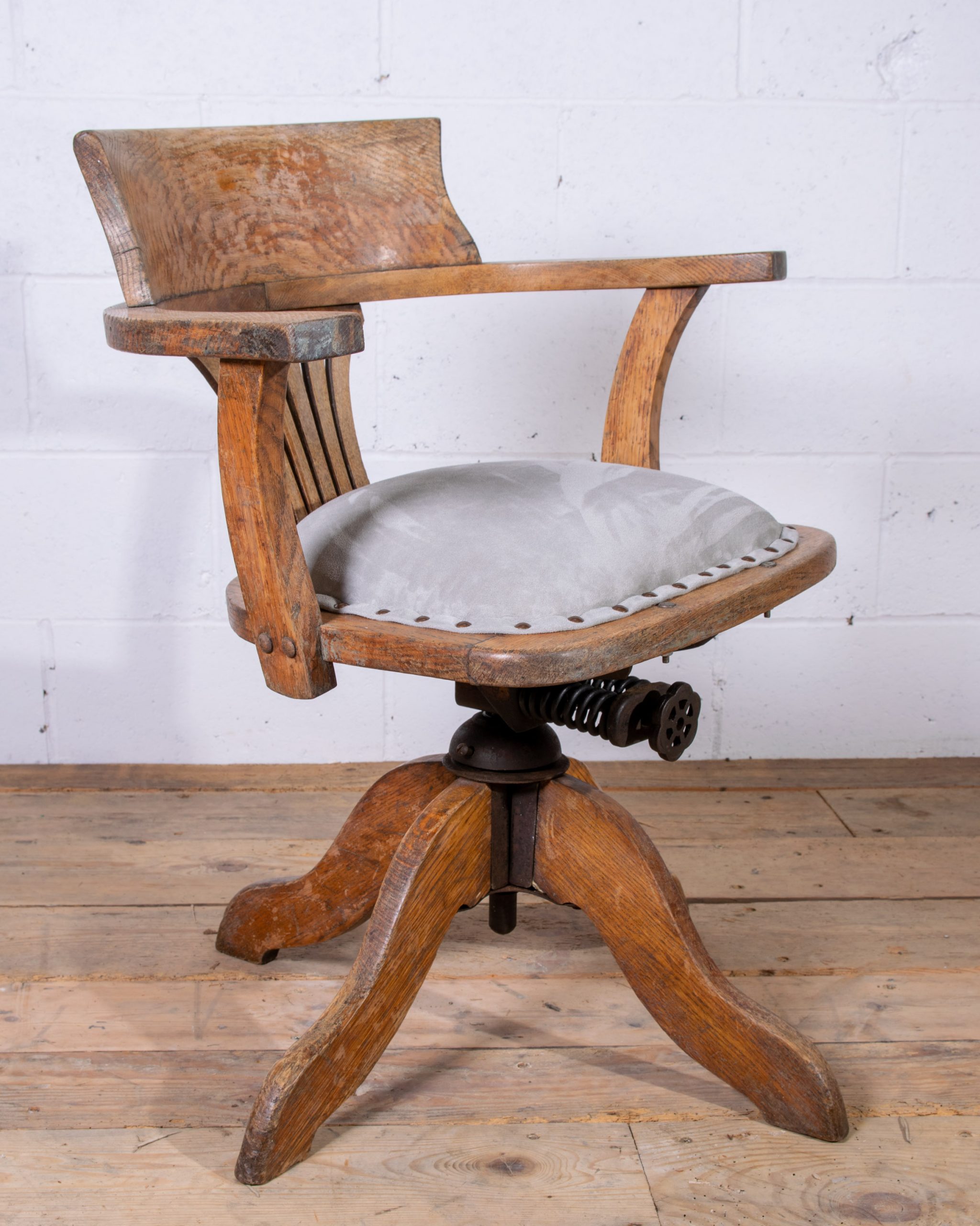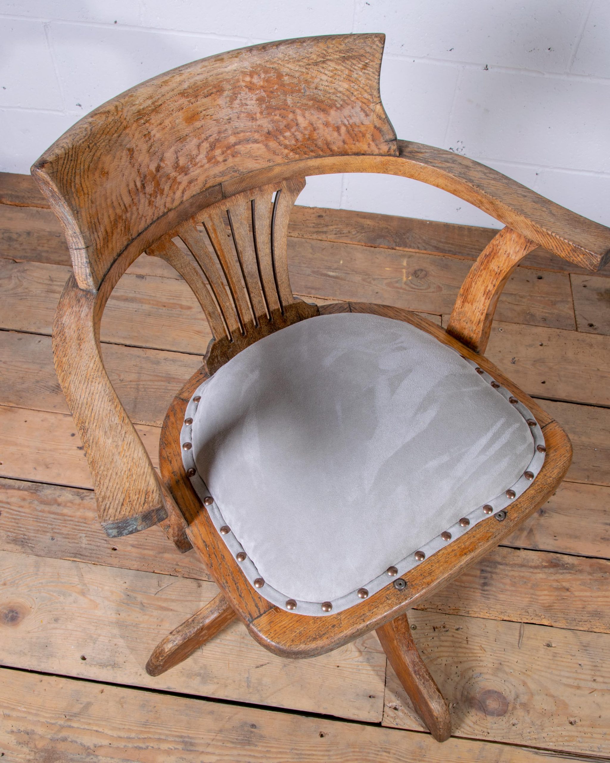 A vintage 1930’s english oak tilt swivel captain’s desk chair.  The chair has undergone extensive restoration including cleaning and re-machining new bolts and rivets to the tilt/swivel mechanism to reduce play.  The chair seat has been completely rebuilt with hand lashed springs and latex horsehair.  Luxurious Italian suede covers the seat.