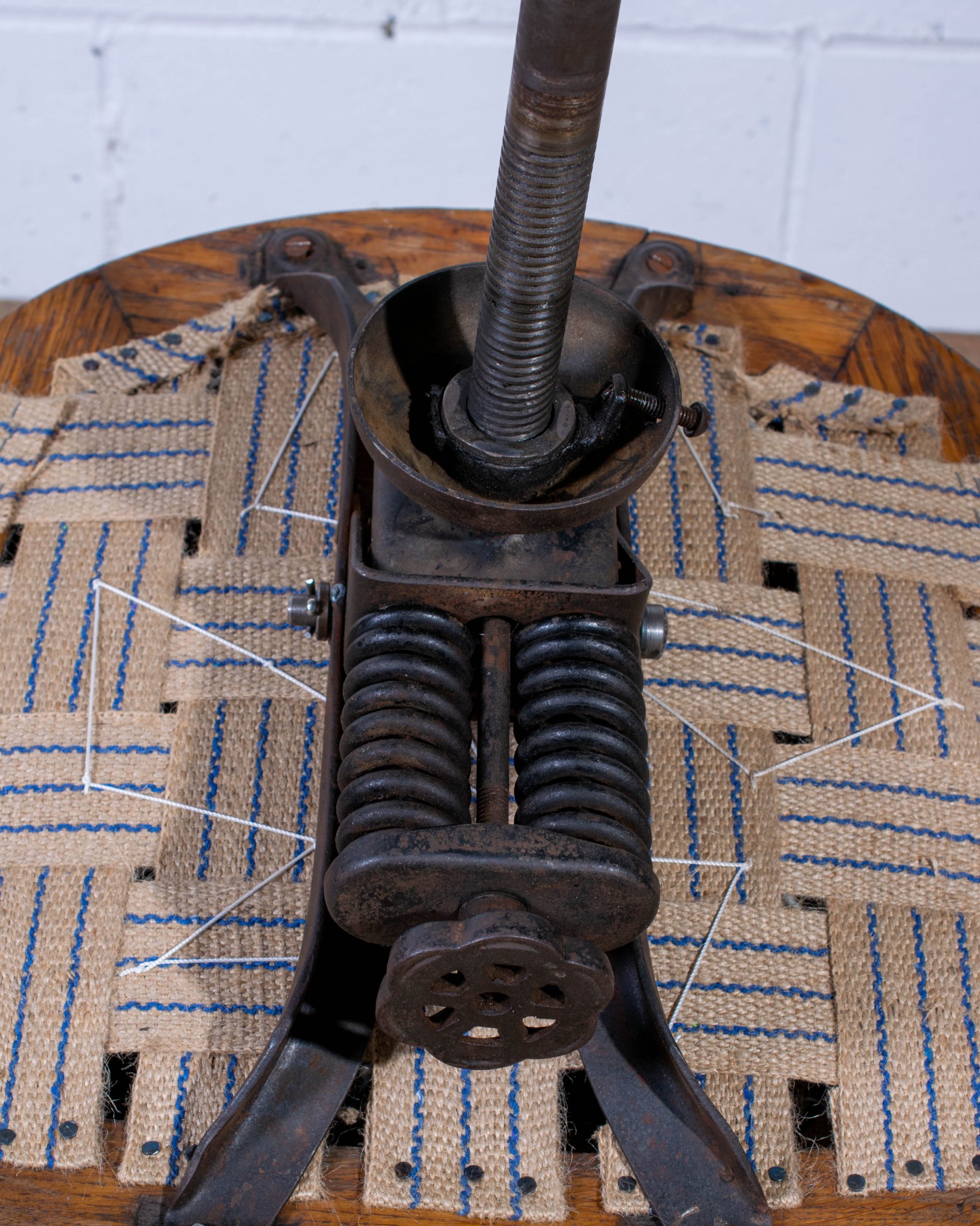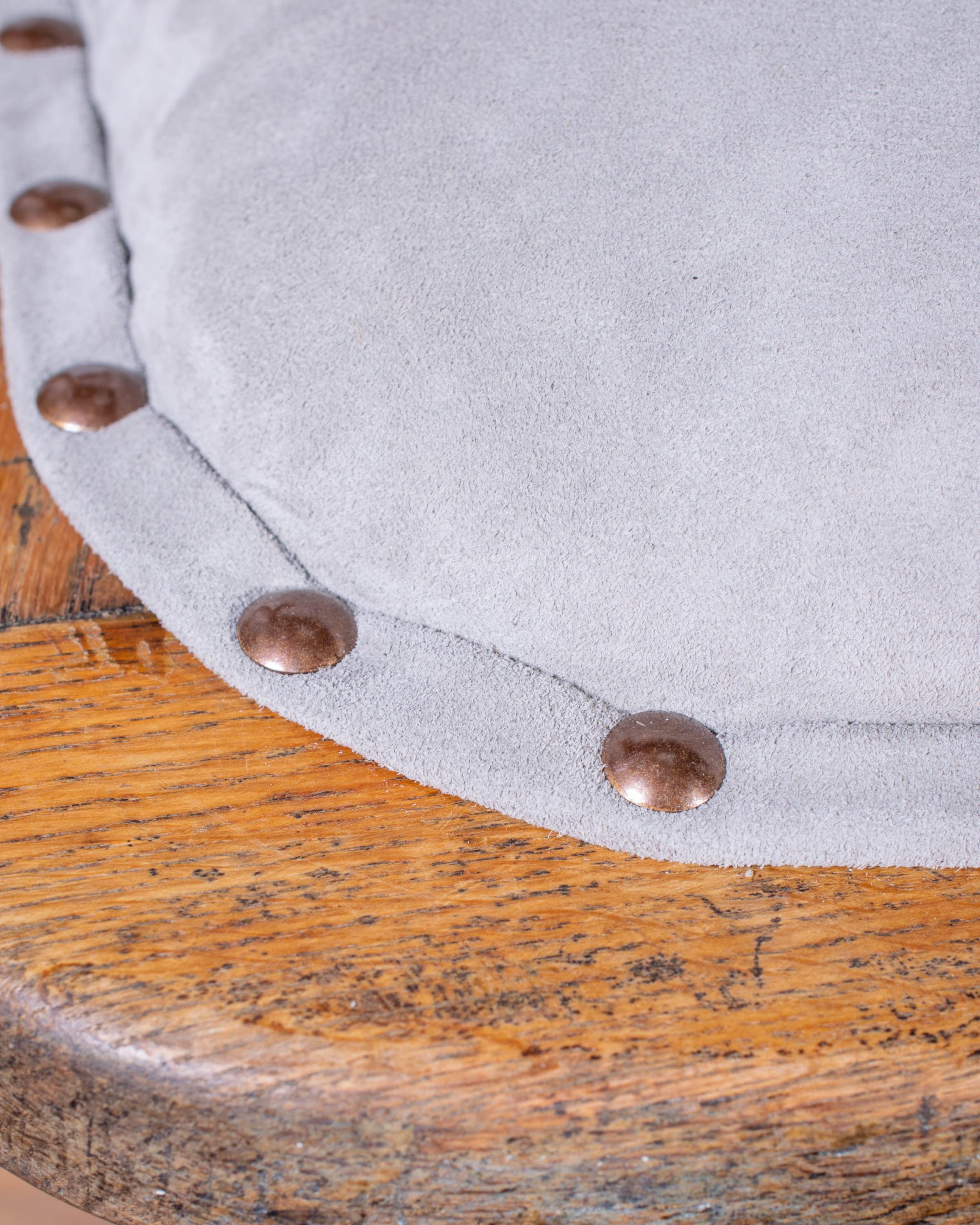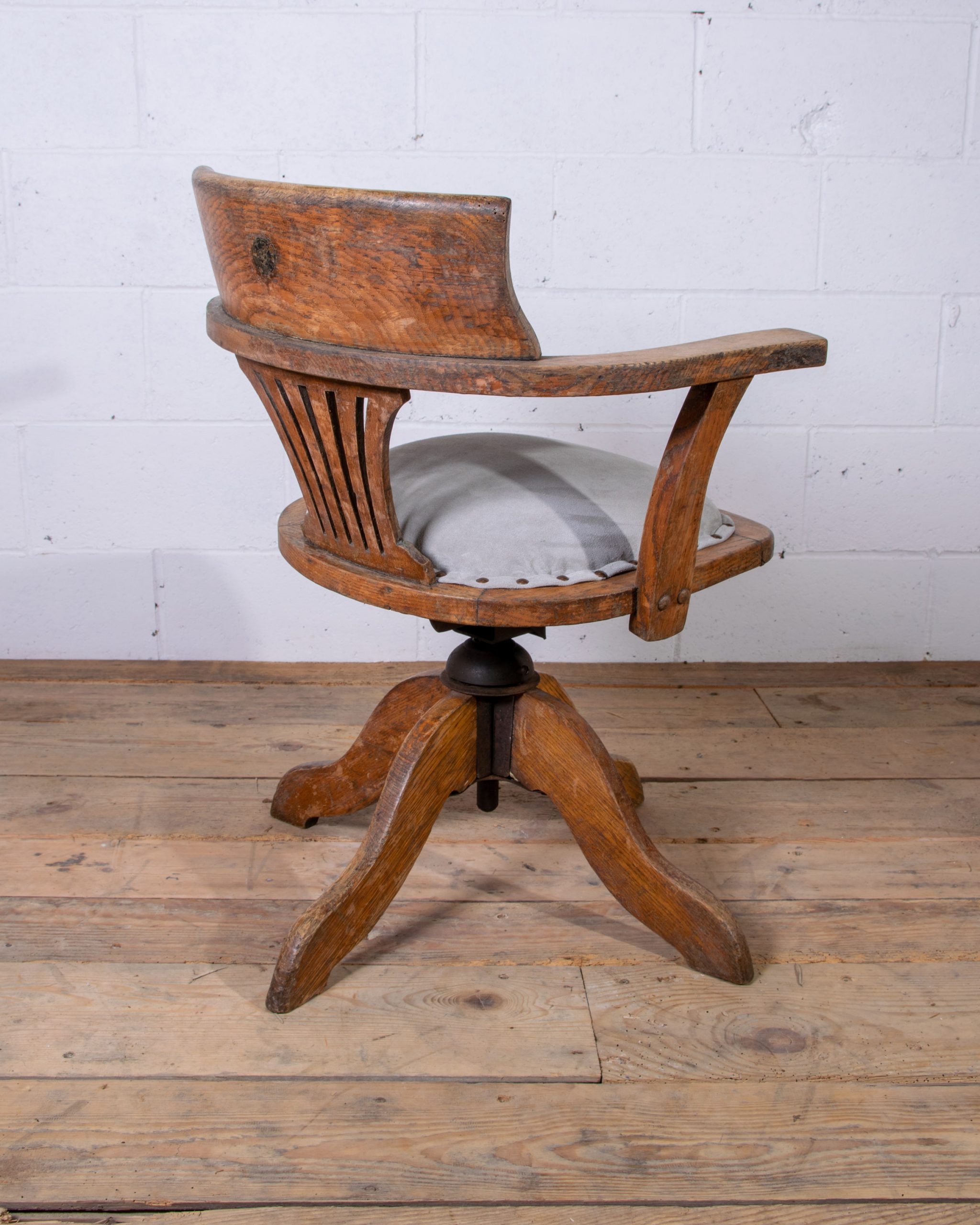 A vintage 1930’s english oak tilt swivel captain’s desk chair.  The chair has undergone extensive restoration including cleaning and re-machining new bolts and rivets to the tilt/swivel mechanism to reduce play.  The chair seat has been completely rebuilt with hand lashed springs and latex horsehair.  Luxurious Italian suede covers the seat.