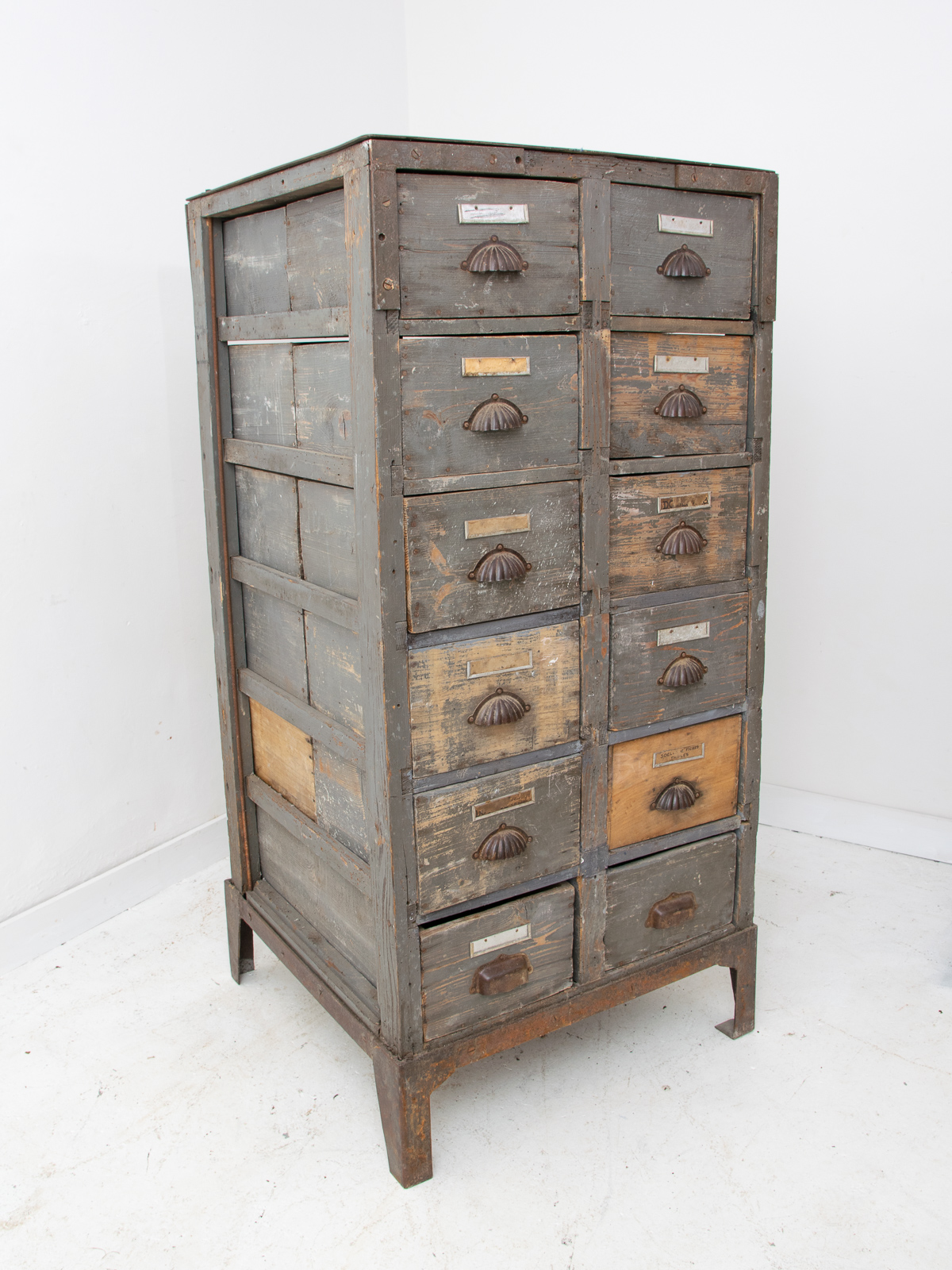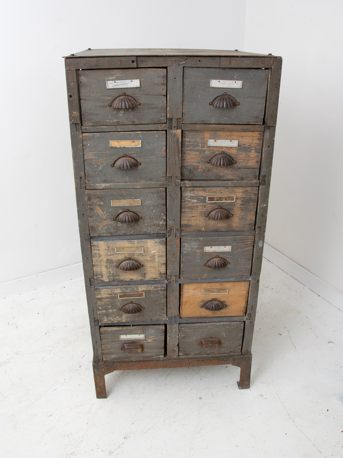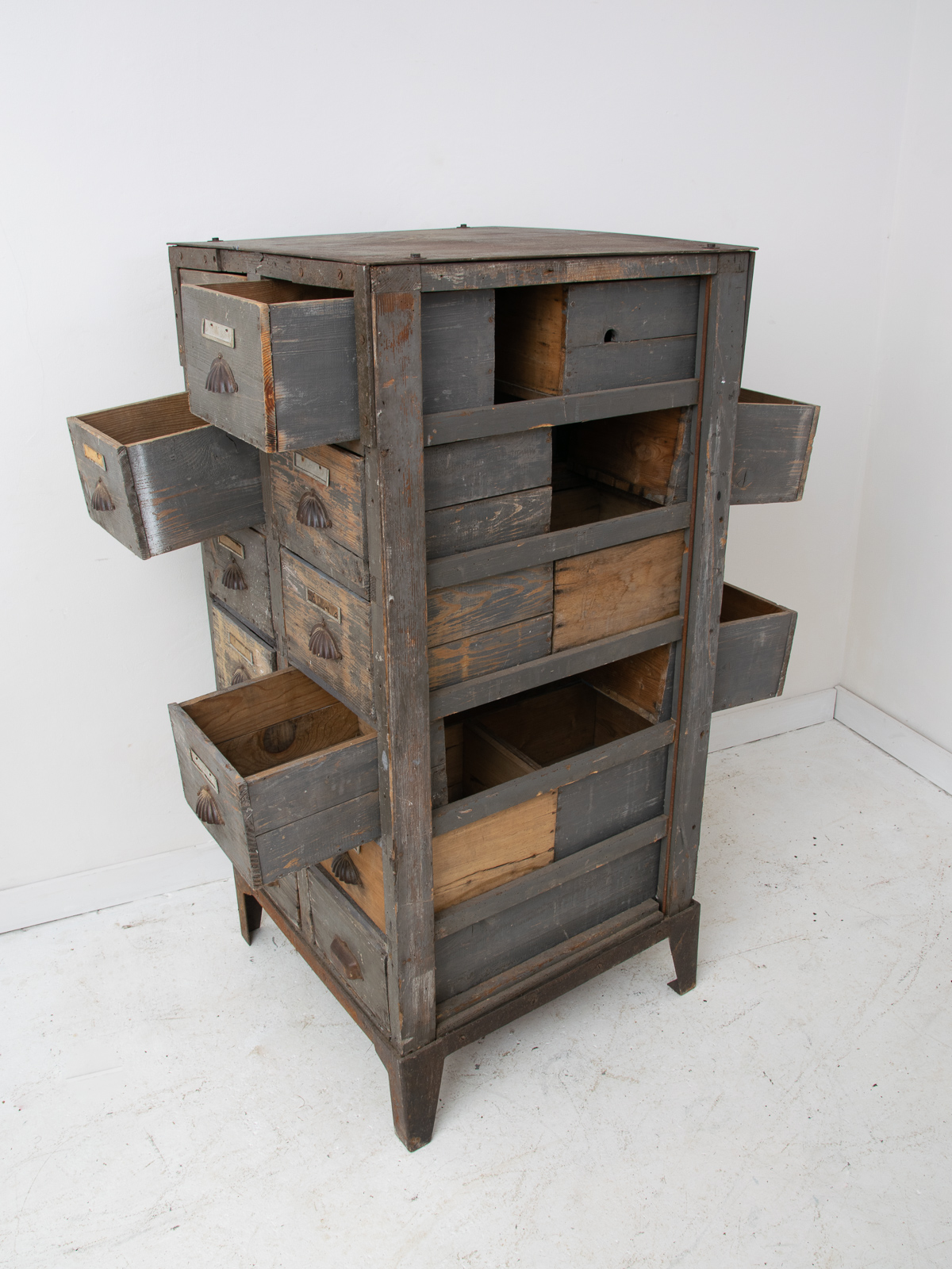 A rare and unusual vintage industrial bank of drawers with cast iron frame and painted pine drawers. French, early 20th century. Drawers open both sides of the cabinet.