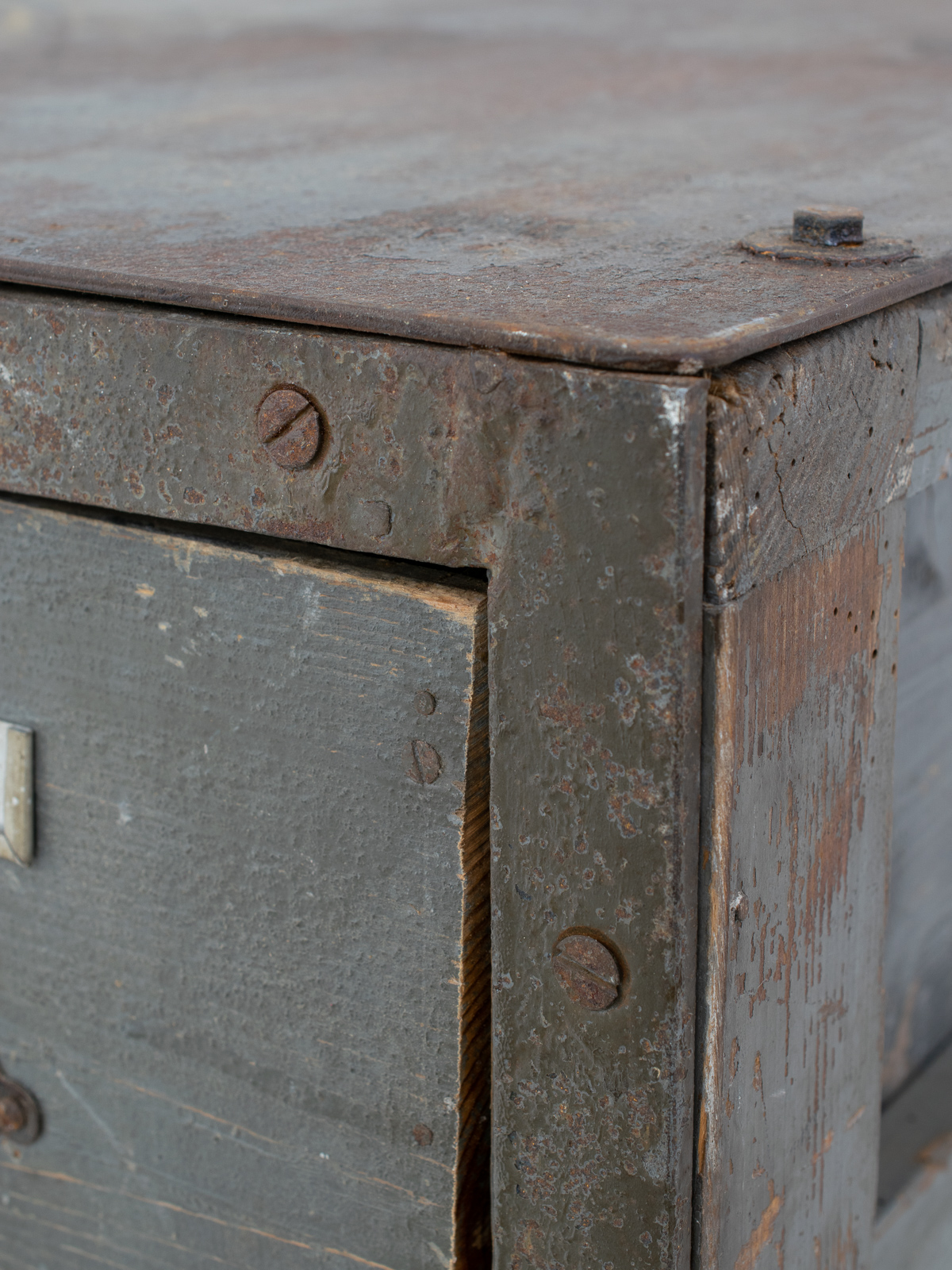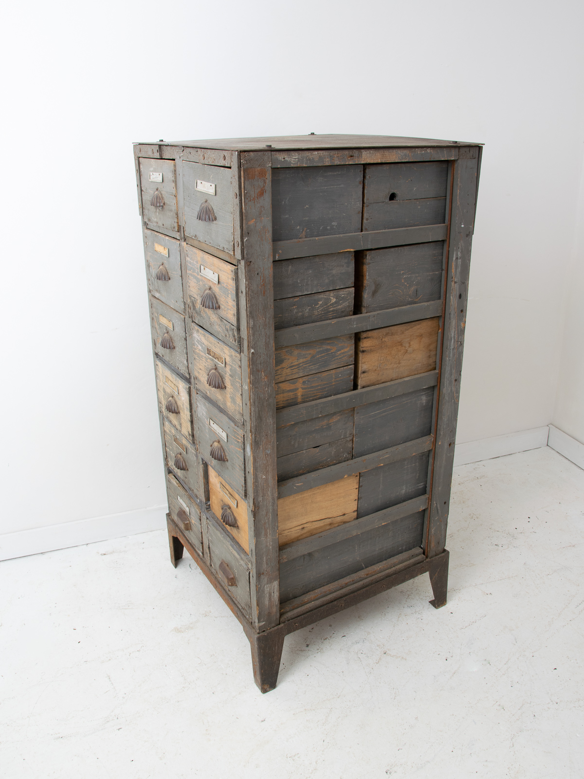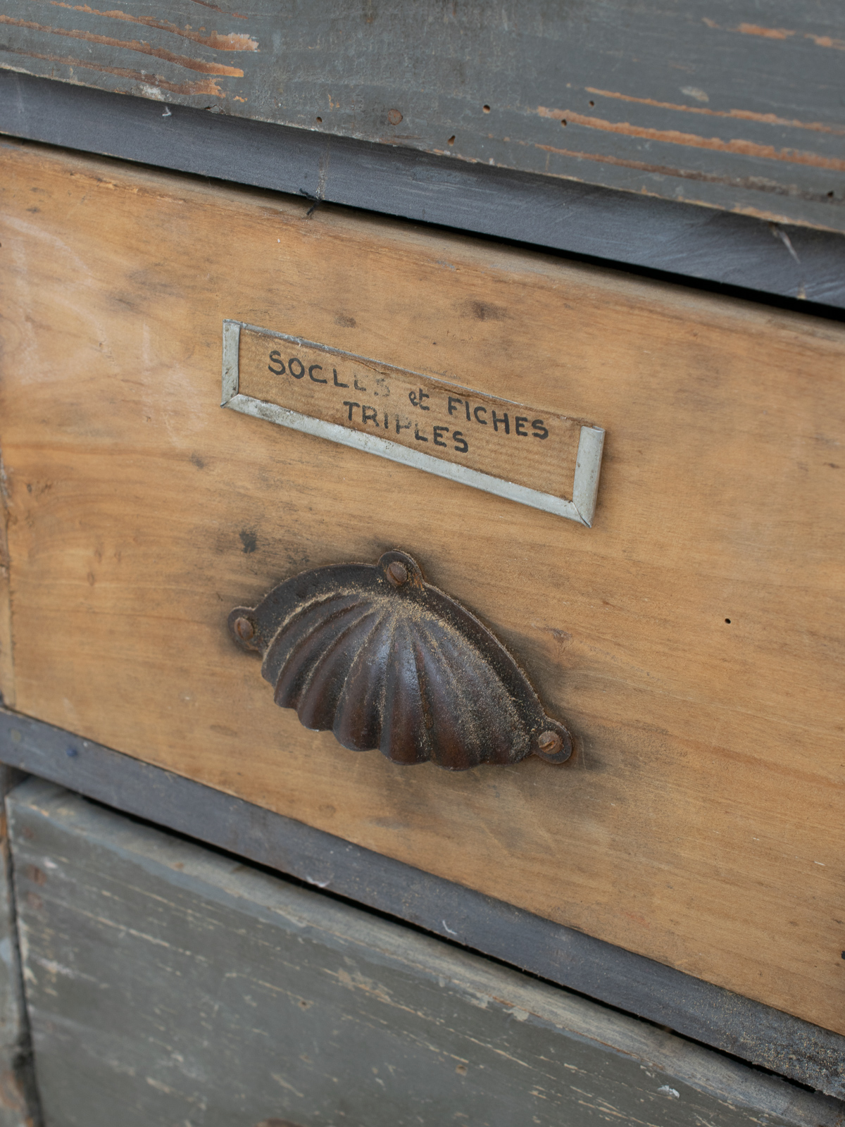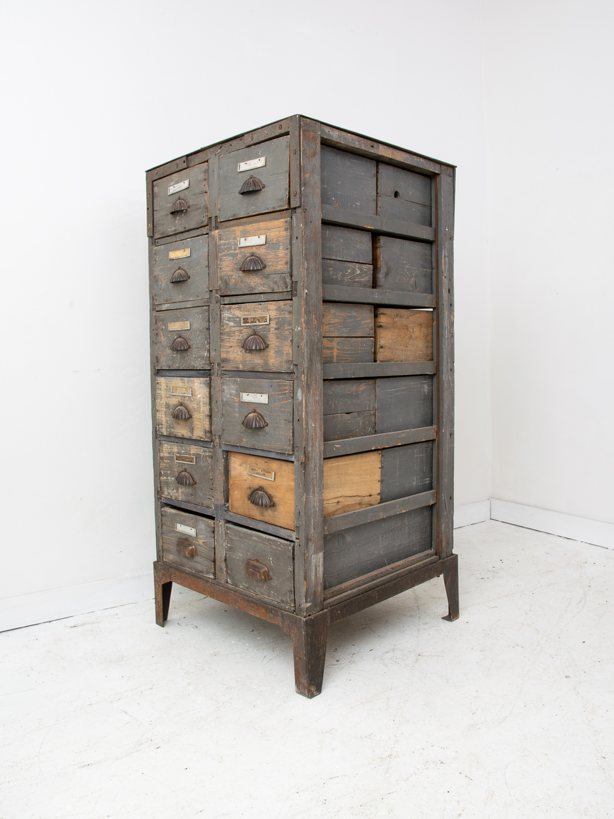 A rare and unusual vintage industrial bank of drawers with cast iron frame and painted pine drawers. French, early 20th century. Drawers open both sides of the cabinet.