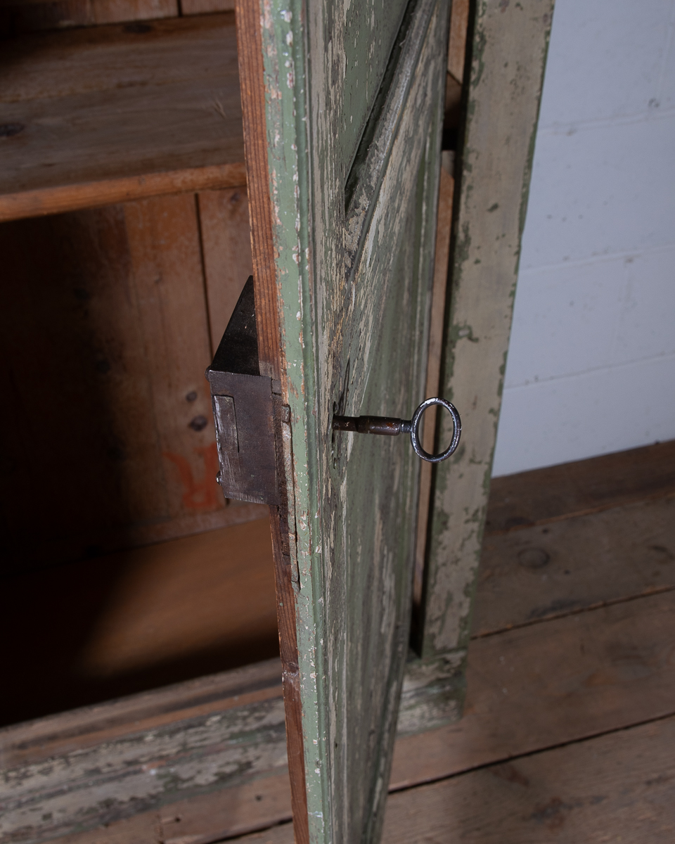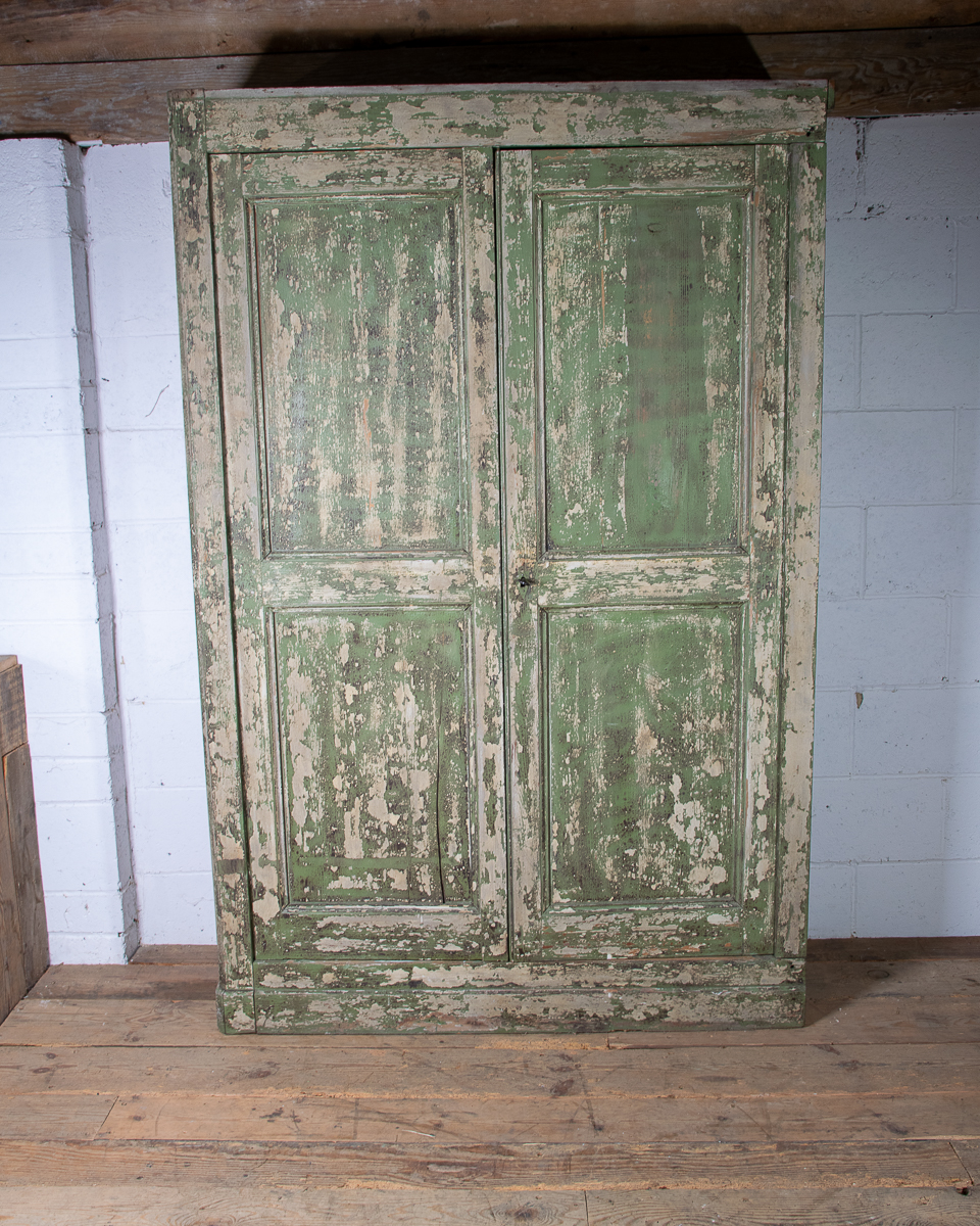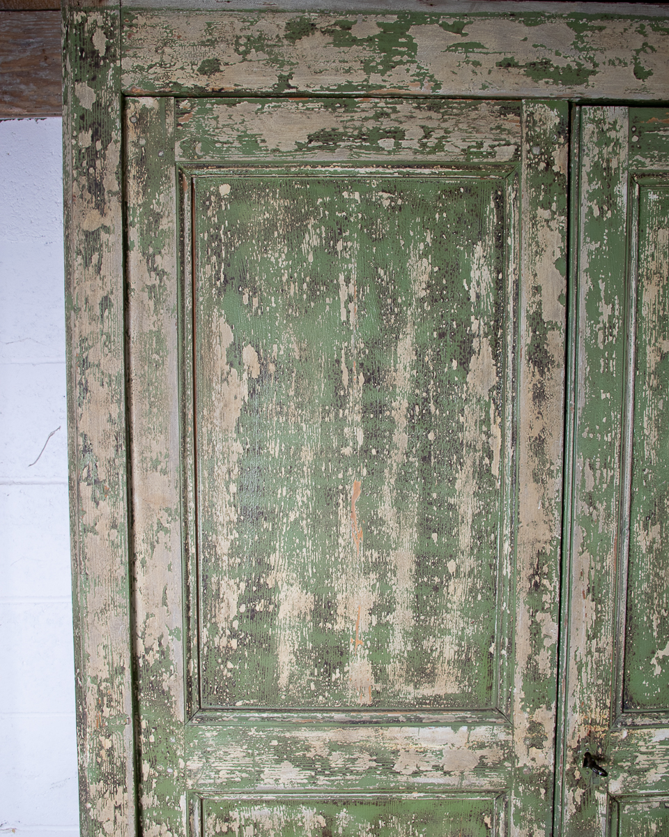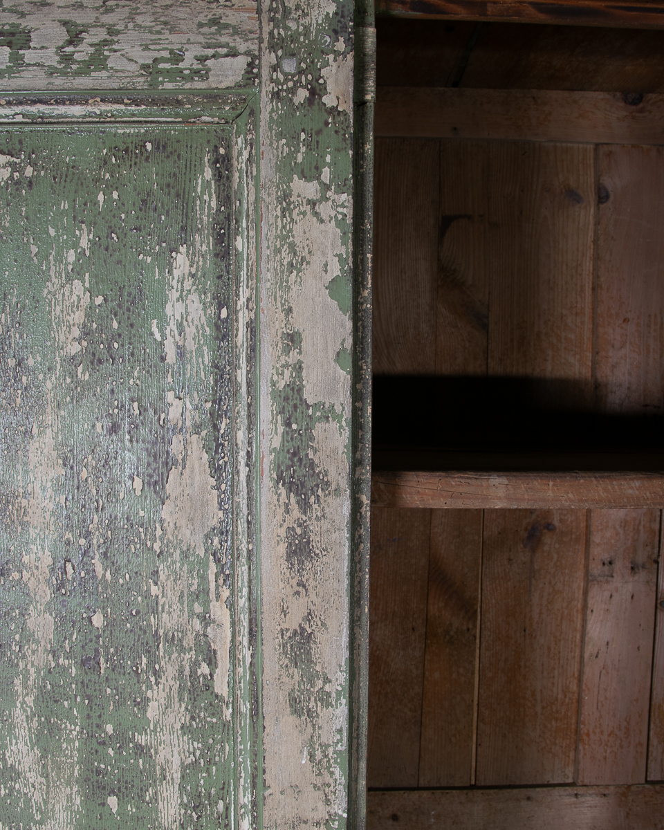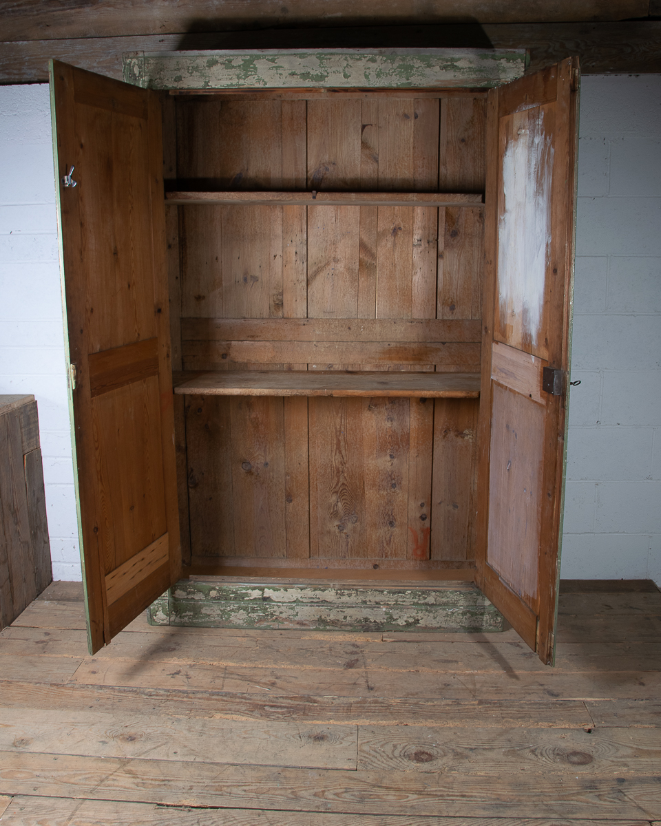 19th century 2 door pitch pine cupboard with shelves. Currently 2 shelves but more could be added. Highly patinated green painted distressed exterior.