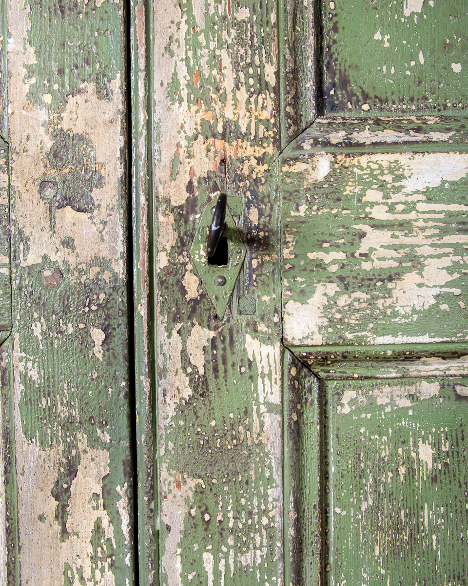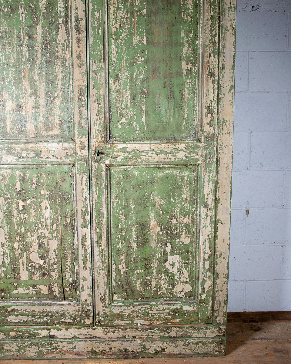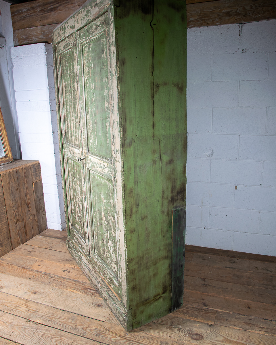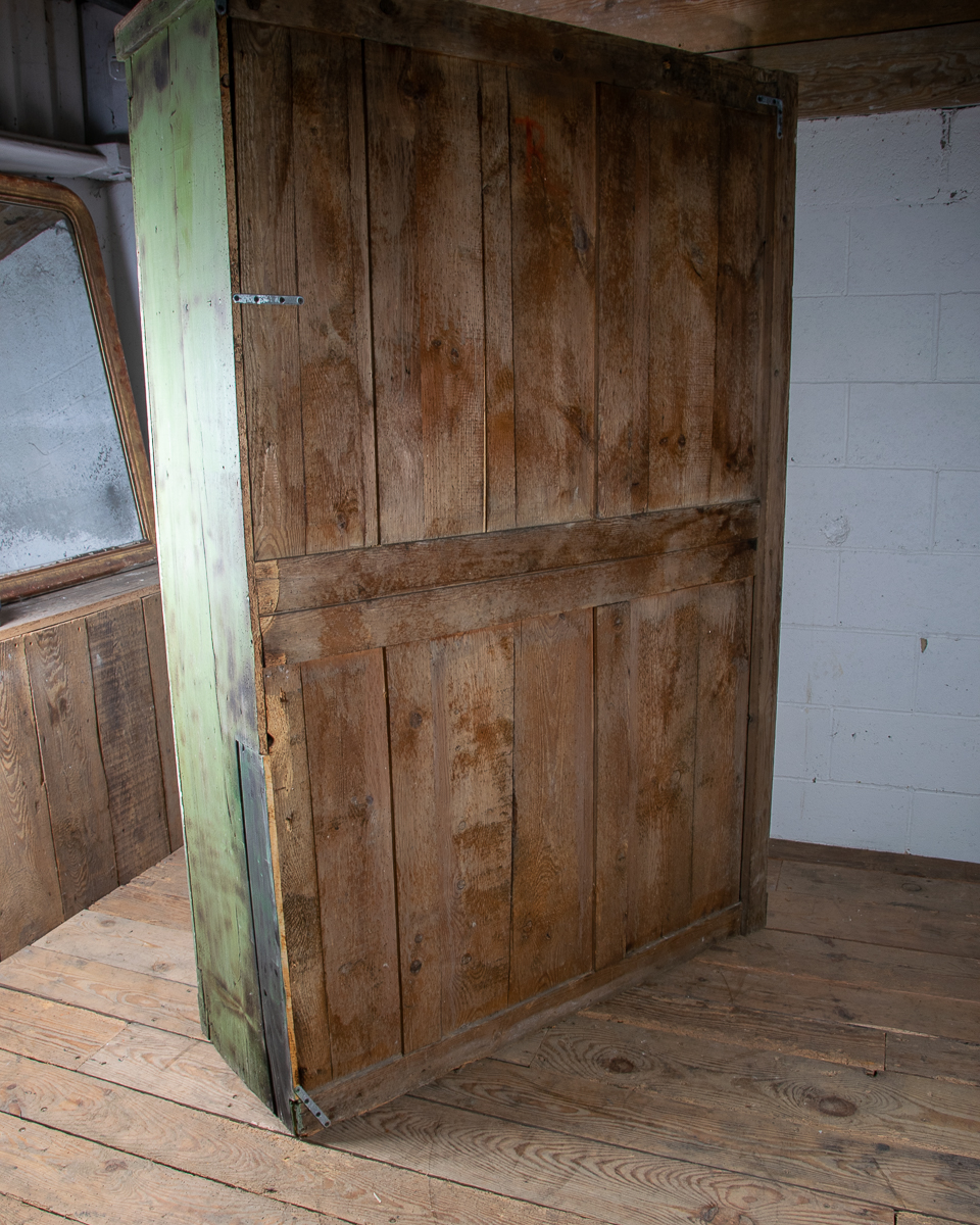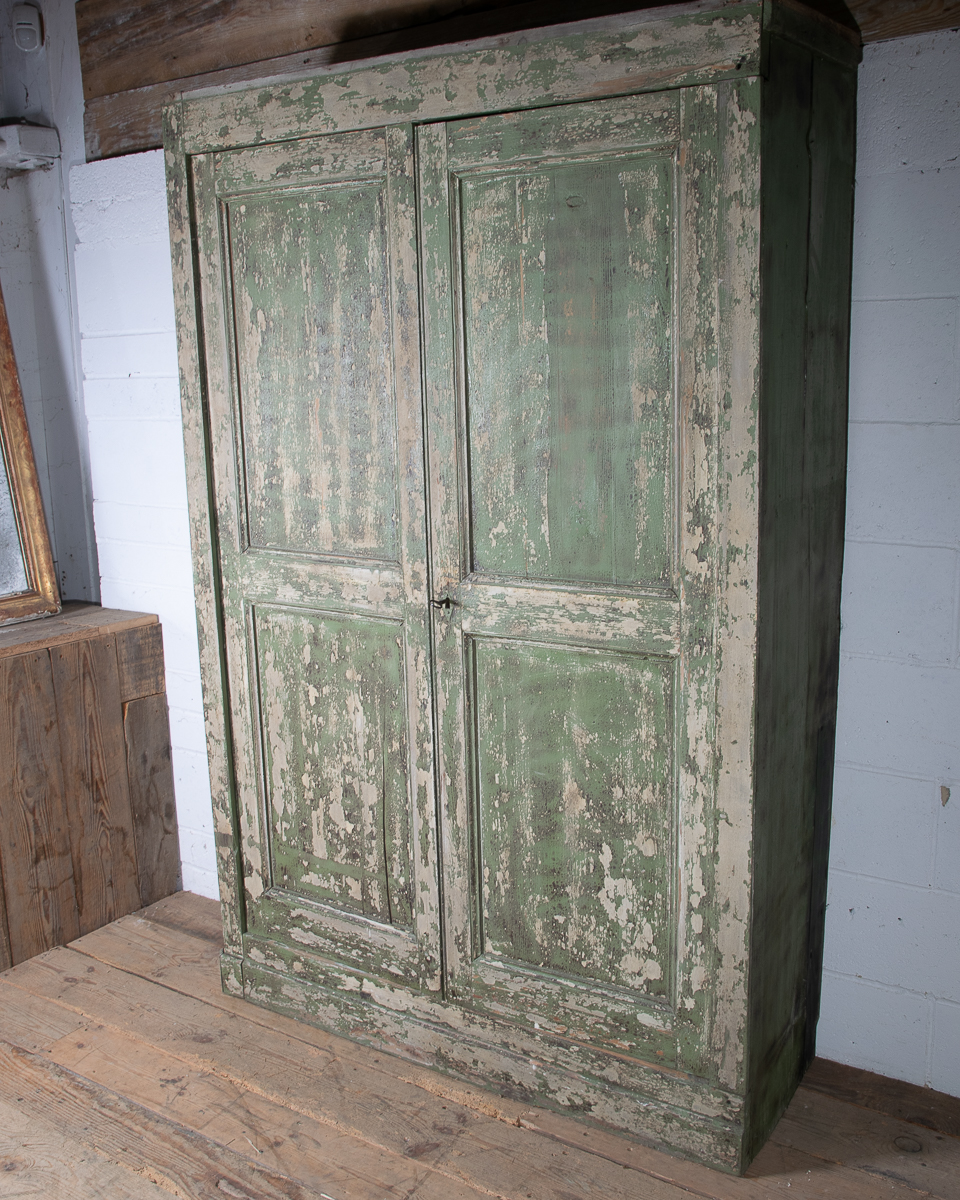 19th century 2 door pitch pine cupboard with shelves. Currently 2 shelves but more could be added. Highly patinated green painted distressed exterior.