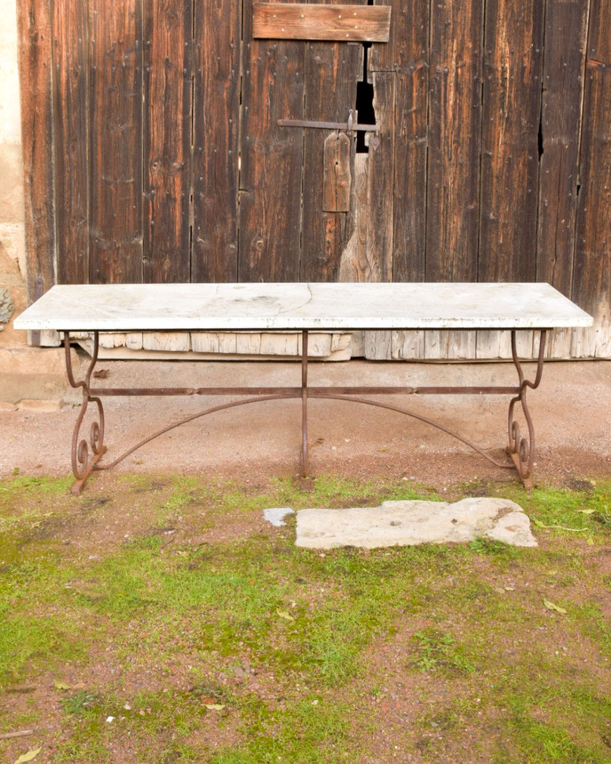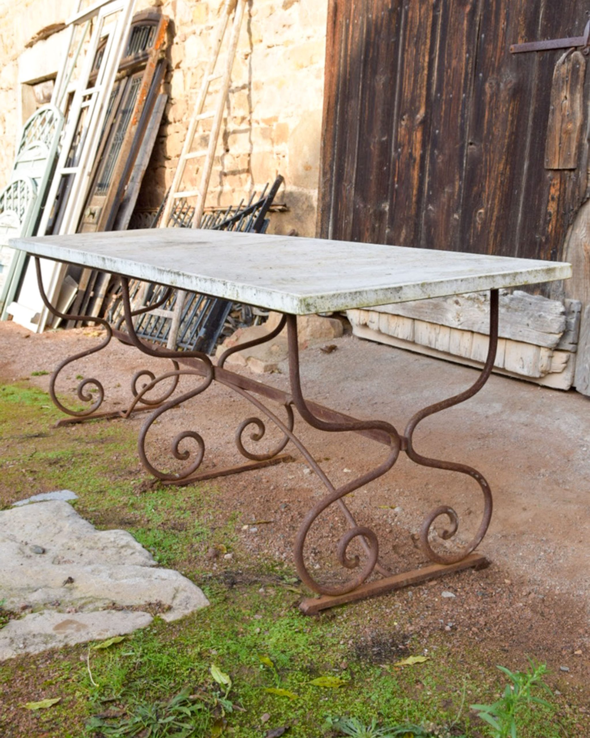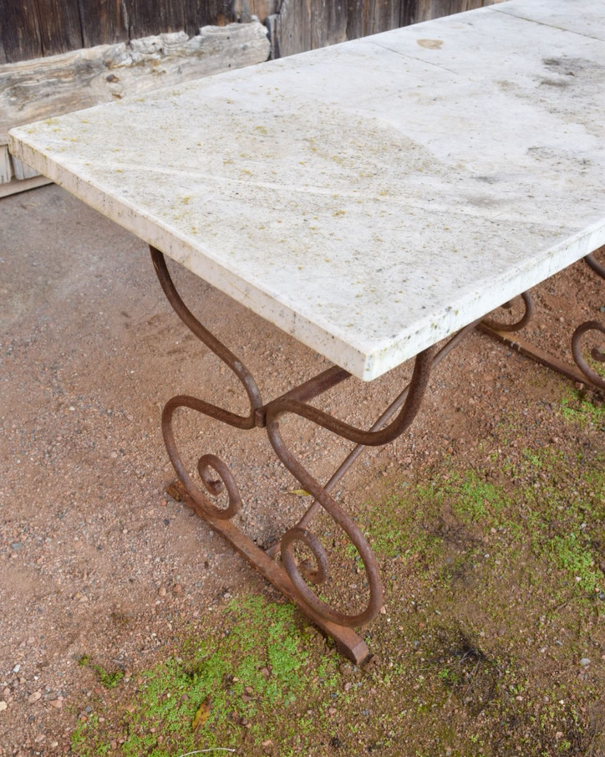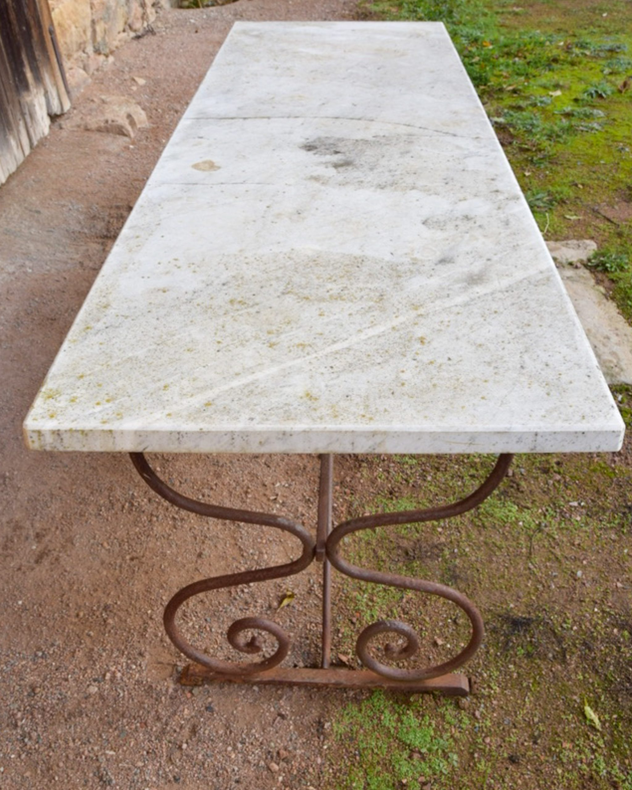 A large late 19th century French garden dining table. Wrought iron scrollwork base with solid antique marble top. The marble top is showing signs of patina and has had a repair in the middle for a crack. Very heavy!