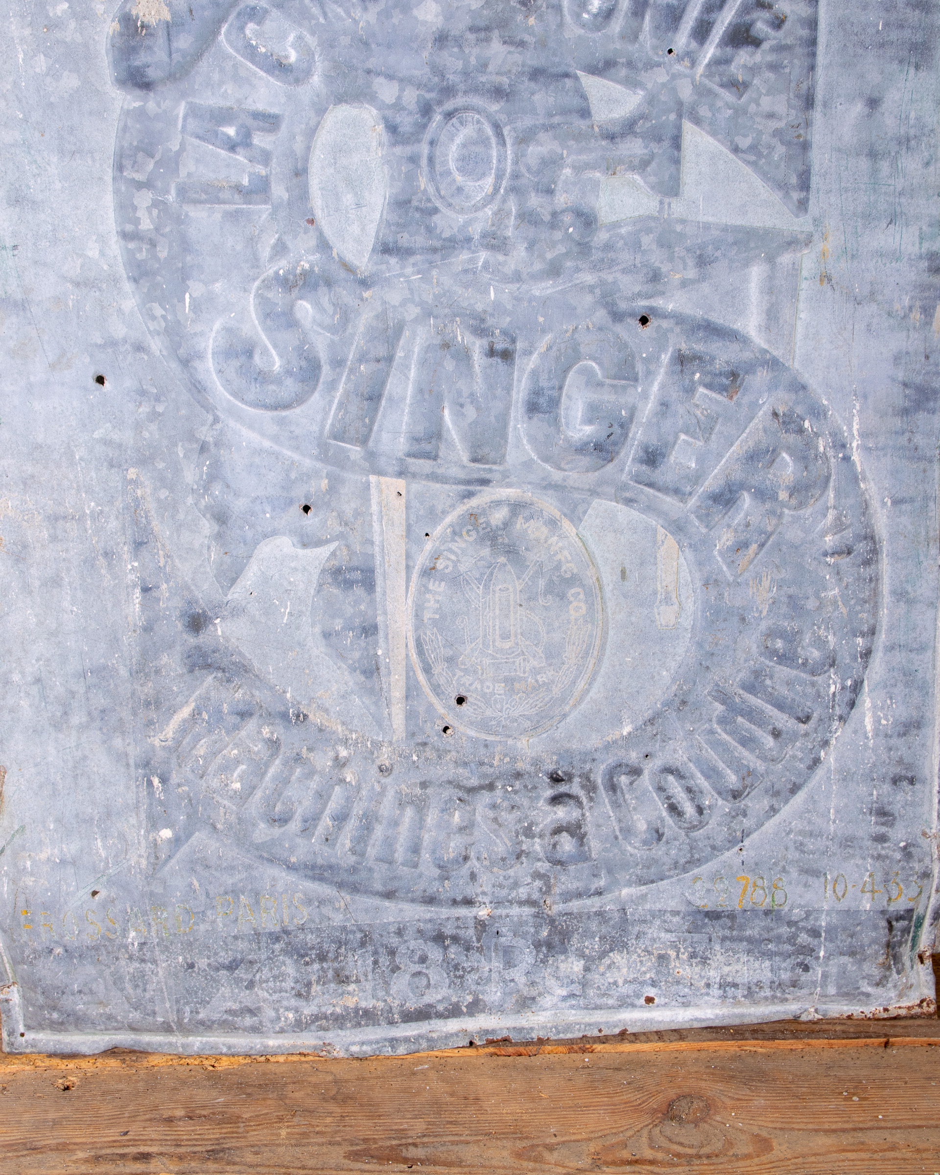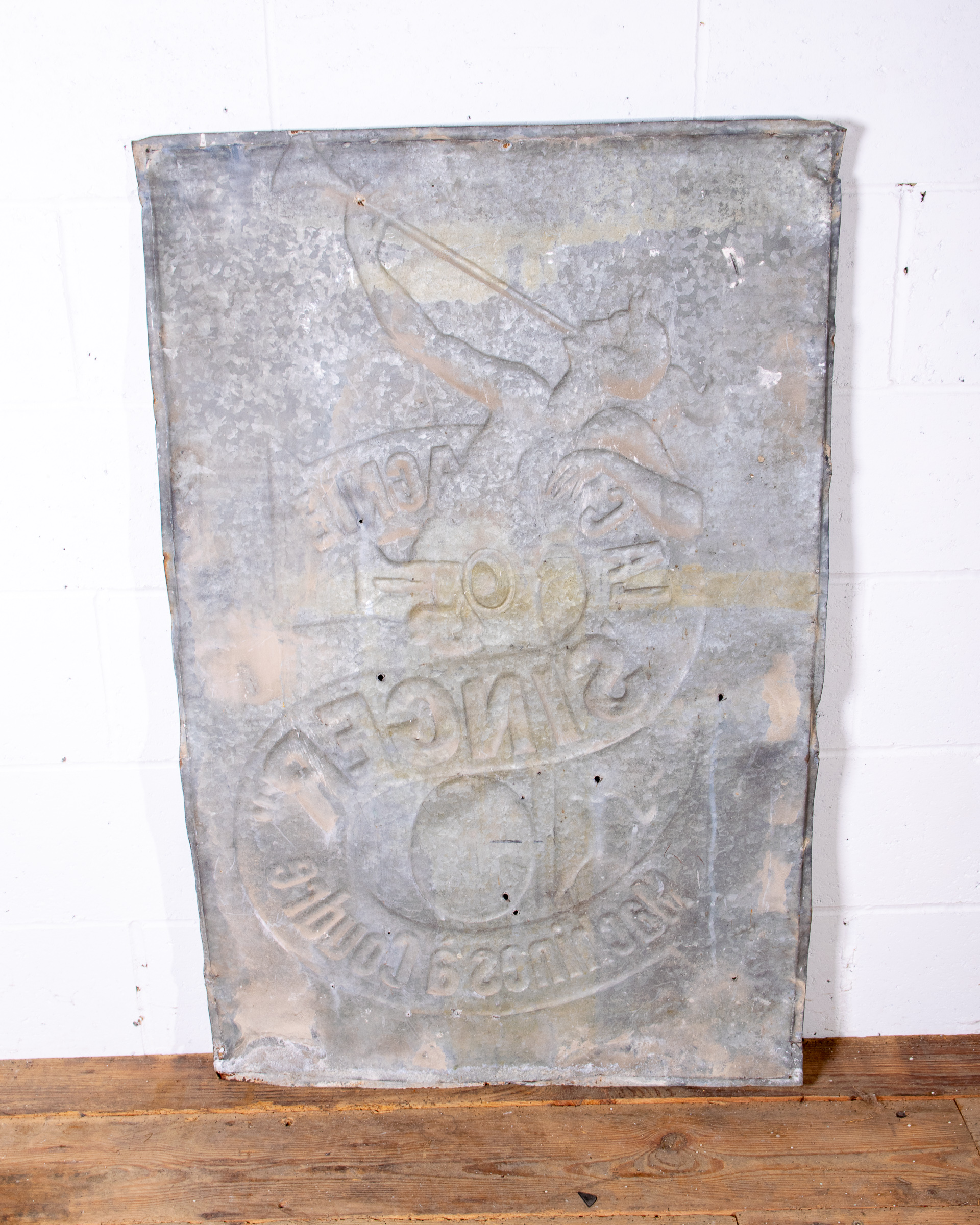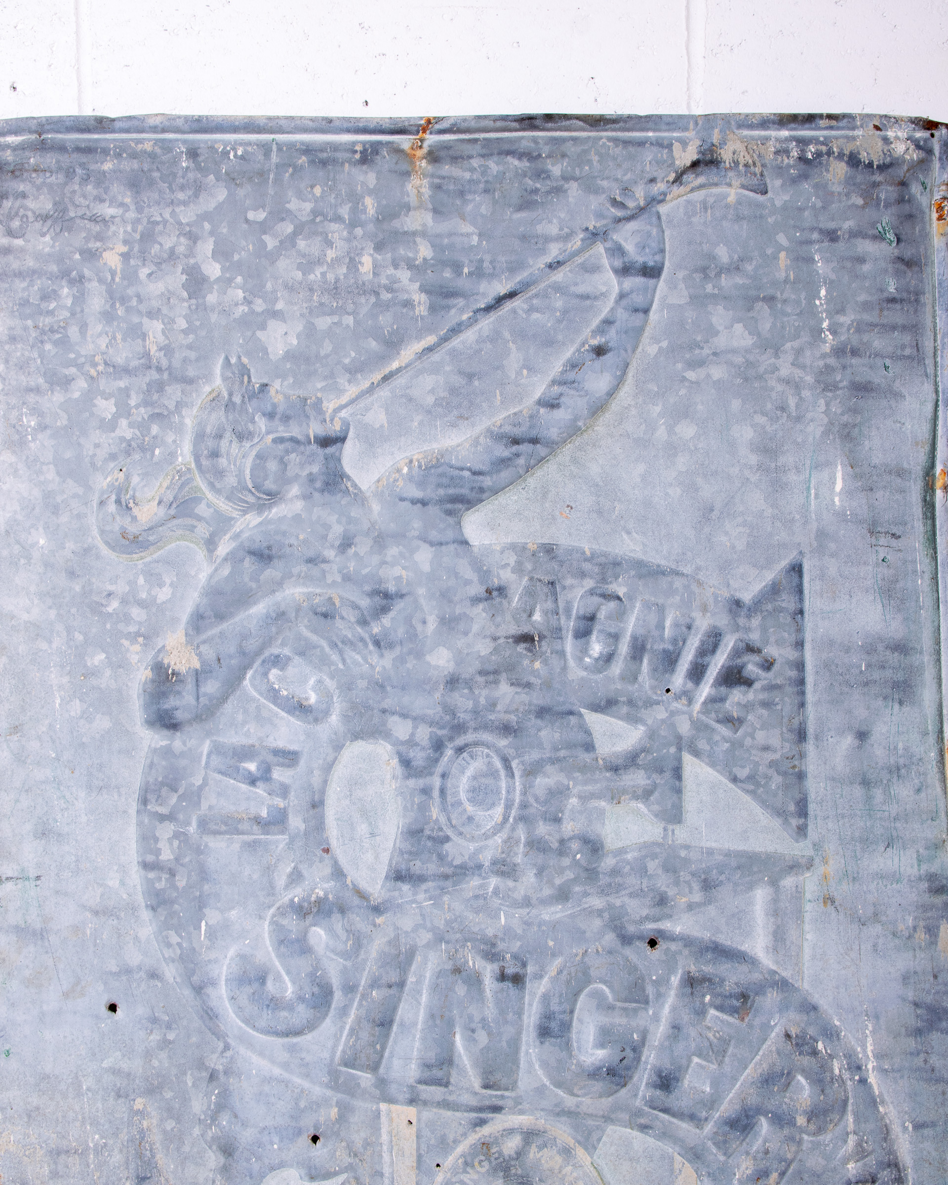 A rare 1930’s advertising sign for Singer Sewing machines. Manufactured in zinc with embossed logo and detailing. Date stamped 10.03.33